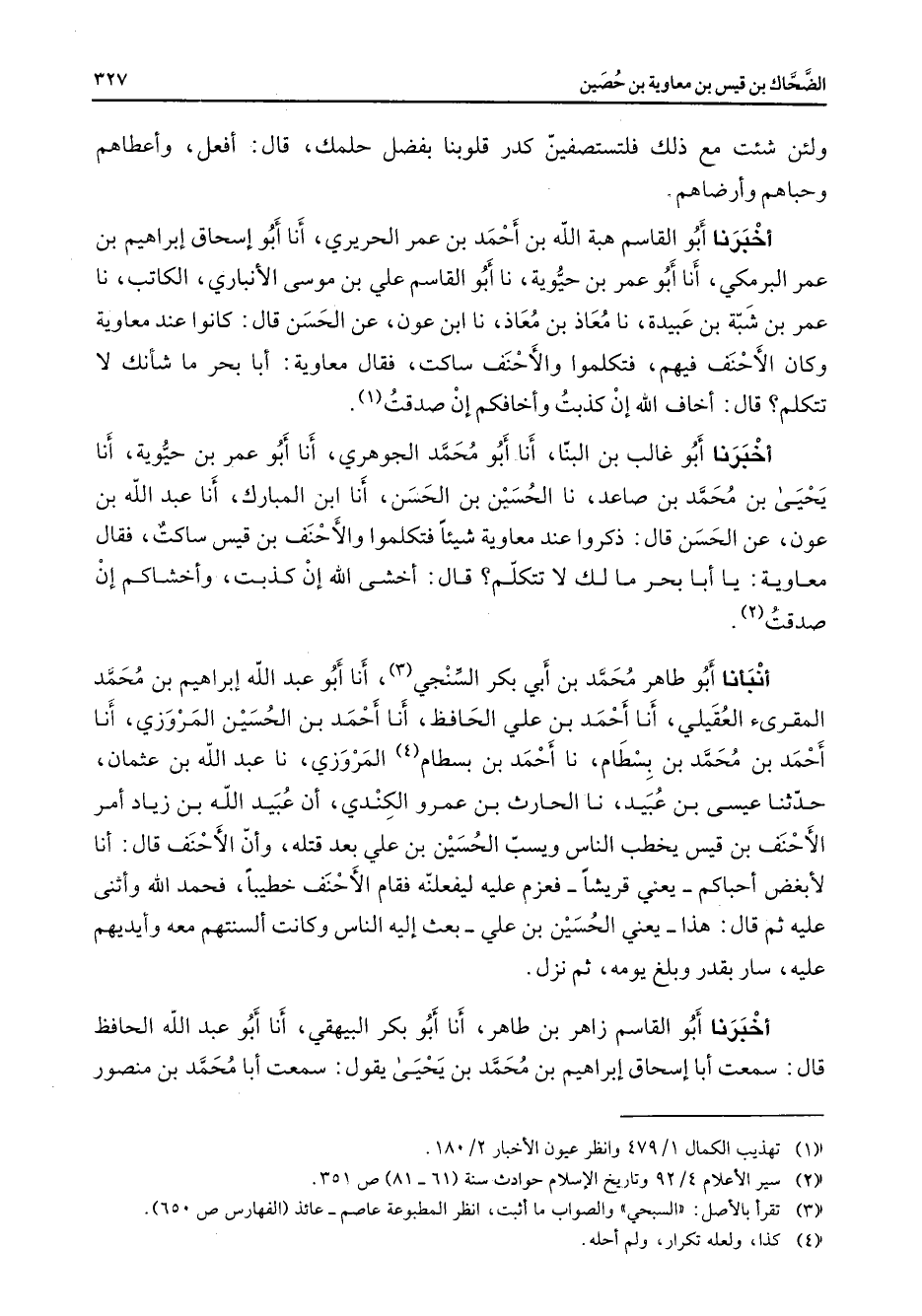 أنبأنا أبو طاهر محمد بن أبي بكر السنجي (3) أنا أبو عبد الله إبراهيم بن محمد المقرئ العقيلي أنا أحمد بن علي الحافظ أنا أحمد بن الحسين المروزي أنا أحمد بن محمد بن بسطام (4) نا أحمد بن بسطام المروزي نا عبد الله بن عثمان حدثنا عيسى بن عبيد نا الحارث بن عمرو الكندي أن عبيد الله بن زياد أمر الأحنف بن قيس يخطب الناس ويسب الحسين بن علي بعد قتله وأن الأحنف قال أنا لأبغض أحباكم يعني قريشا فعزم عليه ليفعلنه فقام الأحنف خطيبا فحمد الله وأثنى عليه ثم قال هذا يعني الحسين بن علي بعث إليه الناس وكانت ألسنتهم معه وأيديهم عليه سار بقدر وبلغ يومه ثم نزل أخبرنا أبو القاسم زاهر بن طاهر أنا أبو بكر البيهقي أنا أبو عبد الله الحافظ قال سمعت أبا إسحاق إبراهيم بن محمد بن يحيى يقول سمعت أبا محمد بن منصور