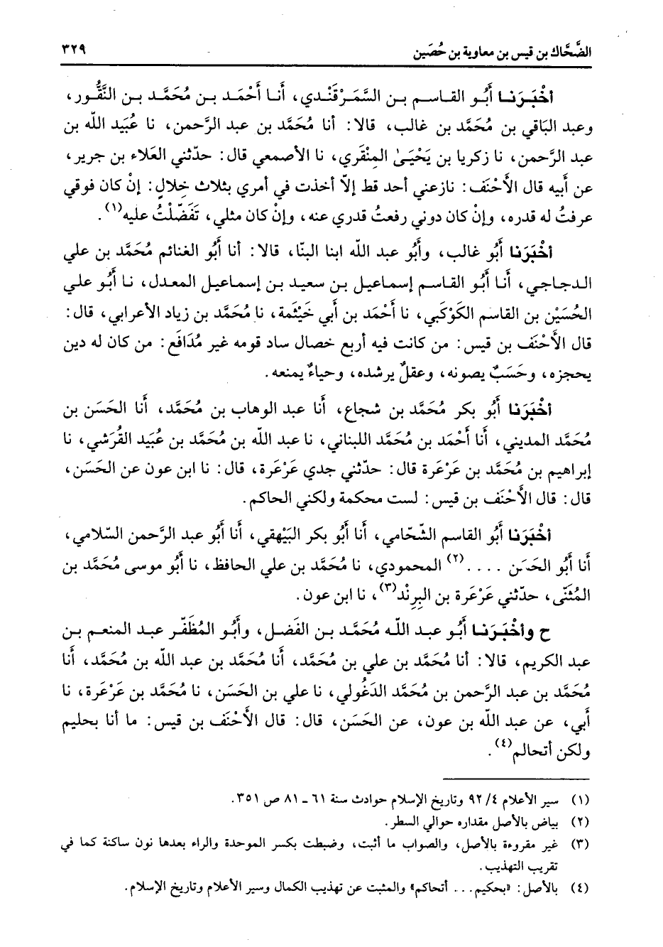أخبرنا أبو غالب وأبو عبد الله ابنا البنا قالا أنا أبو الغنائم محمد بن علي الدجاجي أنا أبو القاسم إسماعيل بن سعيد بن إسماعيل المعدل نا أبو علي الحسين بن القاسم الكوكبي نا أحمد بن أبي خيثمة نا محمد بن زياد الأعرابي قال قال الأحنف بن قيس من كانت فيه أربع خصال ساد قومه غير مدافع من كان له دين يحجزه وحسب يصونه وعقل يرشده وحياء يمنعه أخبرنا أبو بكر محمد بن شجاع أنا عبد الوهاب بن محمد أنا الحسن بن محمد المديني أنا أحمد بن محمد اللبناني نا عبد الله بن محمد بن عبيد القرشي نا إبراهيم بن محمد بن عرعرة قال حدثني جدي عرعرة قال نا ابن عون عن الحسن قال قال الأحنف بن قيس لست محكمة ولكني الحاكم أخبرنا أبو القاسم الشحامي أنا أبو بكر البيهقي أنا أبو عبد الرحمن السلامي أنا أبو الحسن (2) المحمودي نا محمد بن علي الحافظ نا أبو موسى محمد بن المثنى حدثني عرعرة ابن البرند (3) نا ابن عون ح وأخبرنا أبو عبد الله محمد بن الفضل وأبو المظفر عبد المنعم بن عبد الكريم قالا أنا محمد بن علي بن محمد أنا محمد بن عبد الله بن محمد أنا محمد بن عبد الرحمن بن محمد الدغولي نا علي بن الحسن نا محمد بن عرعرة نا أبي عن عبد الله بن عون عن الحسن قال قال الأحنف بن قيس ما أنا بحليم ولكن أتحالم (4)