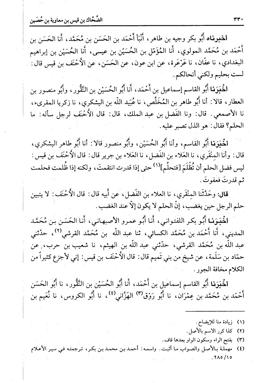 أخبرناه أبو بكر وجيه بن طاهر أنبأ أحمد بن الحسن بن محمد أنا الحسن بن أحمد بن محمد المولوي أنا المؤمل بن الحسين بن عيسى أنا الحسين بن إبراهيم البغدادي نا عفان نا عرعرة عن ابن عون عن الحسن عن الأحنف بن قيس قال لست بحليم ولكني أتحالكم أخبرنا أبو القاسم إسماعيل بن أحمد أنا أبو الحسين بن النقور وأبو منصور بن العطار قالا أنا أبو طاهر بن المخلص نا عبيد الله بن اليشكري نا زكريا المقرئ نا الأصمعي قال ونا الفضل بن عبد الملك قال قال الأحنف لرجل سأله ما الحلم فقال هو الذل تصبر عليه أخبرنا أبو القاسم وأنا أبو الحسين وأبو منصور قالا أنا أبو طاهر اليشكري قال وأنا المنقري نا العلاء بن الفضل نا العلاء بن جرير قال قال الأحنف بن قيس ليس فضل الحلم أن تظلم فتحلم (1) حتى إذا قدرت انتقمت ولكنه إذا ظلمت فحلمت ثم قدرت فعفوت قال وحدثنا المنقري نا العلاء بن الفضل عن أبيه قال قال الأحنف لا يتبين حلم الرجل حين يغضب إن الحلم لا يكون إلا عند الغضب أخبرنا أبو بكر اللفتواني أنا أبو عمرو الأصبهاني أنا الحسن بن محمد المديني أنا أحمد بن محمد الكسائي ثنا عبد الله بن محمد القرشي حدثني عبد الله بن محمد القرشي (2) حدثني عبد الله بن الهيثم نا شعيب بن حرب عن حماد بن سلمة عن شيخ من بني تميم قال قال الأحنف بن قيس إني لأجزع كثيرا من الكلام مخافة الجور أخبرنا أبو القاسم إسماعيل بن أحمد أنا أبو الحسين بن النقور نا أبو الحسن أحمد بن محمد بن عمران نا أبو روق (3) الهزاني (4) نا أبو الكروس نا نعيم بن