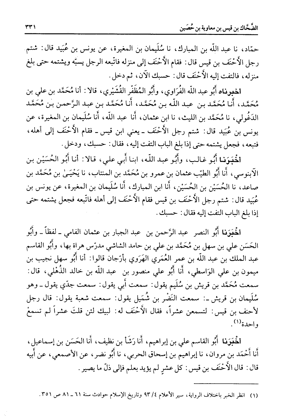حماد نا عبد الله بن المبارك نا سليمان بن المغيرة عن يونس بن عبيد قال شتم رجل الأحنف بن قيس قال فقام الأحنف إلى منزله فاتبعه الرجل يسبه ويشتمه حتى بلغ منزله فالتفت إليه الأحنف قال حسبك الآن ثم دخل أخبرناه أبو عبد الله الفراوي وأبو المظفر القشيري قالا أنا محمد بن علي بن محمد أنا محمد بن عبد الله بن محمد أنا محمد بن عبد الرحمن بن محمد الدغولي نا محمد بن الليث نا ابن عثمان أنا عبد الله أنا سليمان بن المغيرة عن يونس بن عبيد قال شتم رجل الأحنف يعني ابن قيس فقام الأحنف إلى أهله فتبعه فجعل يشتمه حتى إذا بلغ الباب التفت إليه فقال حسبك ودخل أخبرنا أبو غالب وأبو عبد الله ابنا أبي علي قالا أنا أبو الحسين بن الآبنوسي أنا أبو الطيب عثمان بن عمرو بن محمد بن المنتاب نا يحيى بن محمد بن صاعد نا الحسين بن الحسين أنا ابن المبارك أنا سليمان بن المغيرة عن يونس بن عبيد قال شتم رجل الأحنف بن قيس فقام الأحنف إلى أهله فاتبعه فجعل يشتمه حتى إذا بلغ الباب فالتفت إليه فقال حسبك أخبرنا أبو النصر عبد الرحمن بن عبد الجبار بن عثمان الفامي لفظا وأبو الحسن علي بن سهل بن محمد بن علي بن حامد الشاشي مدرس هراة بها وأبو القاسم عبد الملك بن عبد الله بن عمر العمري الهروي بأرجان قالوا أنا أبو سهل نجيب بن ميمون بن علي الواسطي أنا أبو علي منصور بن عبد الله بن خالد الذهلي قال سمعت محمد بن قريش بن سليم يقول سمعت أبي يقول سمعت جدي يقول وهو سليمان بن قريش سمعت النضر بن شميل يقول سمعت شعبة يقول قال رجل لأحنف بن قيس لتسمعن عشرا فقال الأحنف له لبيك لئن قلت عشرا لم تسمع واحدة (1)