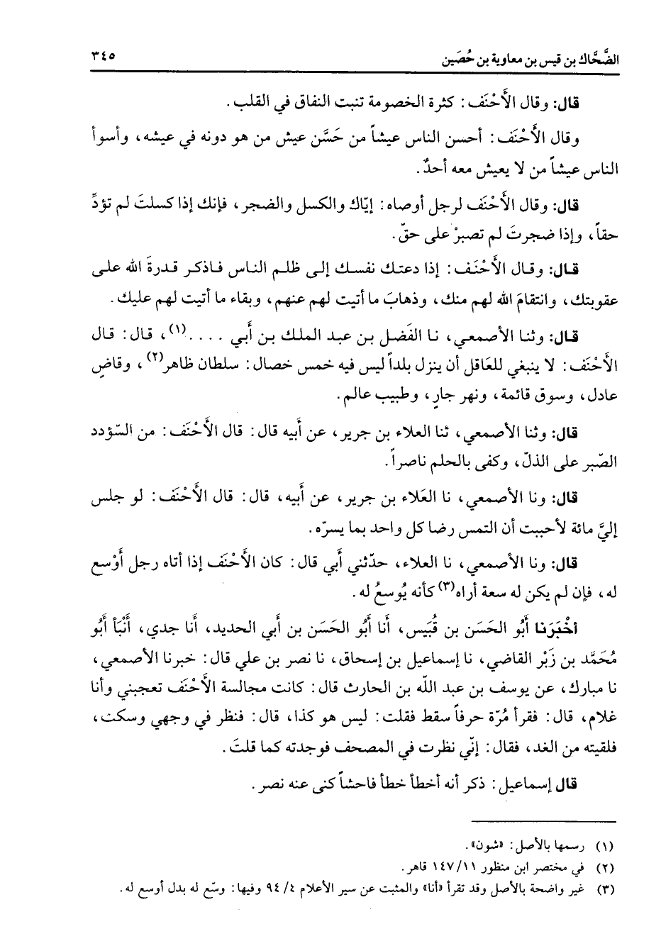 قال وقال الأحنف كثرة الخصومة تنبت النفاق في القلب وقال الأحنف أحسن الناس عيشا من حسن عيش من هو دونه في عيشه وأسوأ الناس عيشا من لا يعيش معه أحد قال وقال الأحنف لرجل أوصاه إياك والكسل والضجر فإنك إذا كسلت لم تؤد حقا وإذا ضجرت لم تصبر على حق قال وقال الأحنف إذا دعتك نفسك إلى ظلم الناس فاذكر قدرة الله على عقوبتك وانتقام الله لهم منك وذهاب ما أتيت لهم عنهم وبقاء ما أتيت لهم عليك قال وثنا الأصمعي نا الفضل بن عبد الملك بن أبي (1) قال قال الأحنف لا ينبغي للعاقل أن ينزل بلدا ليس فيه خمس خصال سلطان ظاهر (2) وقاض عادل وسوق قائمة ونهر جار وطبيب عالم قال وثنا الأصمعي ثنا العلاء بن جرير عن أبيه قال قال الأحنف من السؤدد الصبر على الذل وكفى بالحلم ناصرا قال ونا الأصمعي نا العلاء بن جرير عن أبيه قال قال الأحنف لو جلس إلي مائة لأحببت أن التمس رضا كل واحد بما يسره قال ونا الأصمعي نا العلاء حدثني أبي قال كان الأحنف إذا أتاه رجل أوسع له فإن لم يكن له سعة أراه (3) كأنه يوسع له أخبرنا أبو الحسن بن قبيس أنا أبو الحسن بن أبي الحديد أنا جدي أنبأ أبو محمد بن زبر القاضي نا إسماعيل بن إسحاق نا نصر بن علي قال خبرنا الأصمعي نا مبارك عن يوسف بن عبد الله بن الحارث قال كانت مجالسة الأحنف تعجبني وأنا غلام قال فقرأ مرة حرفا سقط فقلت ليس هو كذا قال فنظر في وجهي وسكت فلقيته من الغد فقال إني نظرت في المصحف فوجدته كما قلت قال إسماعيل ذكر أنه أخطأ خطأ فاحشا كنى عنه نصر