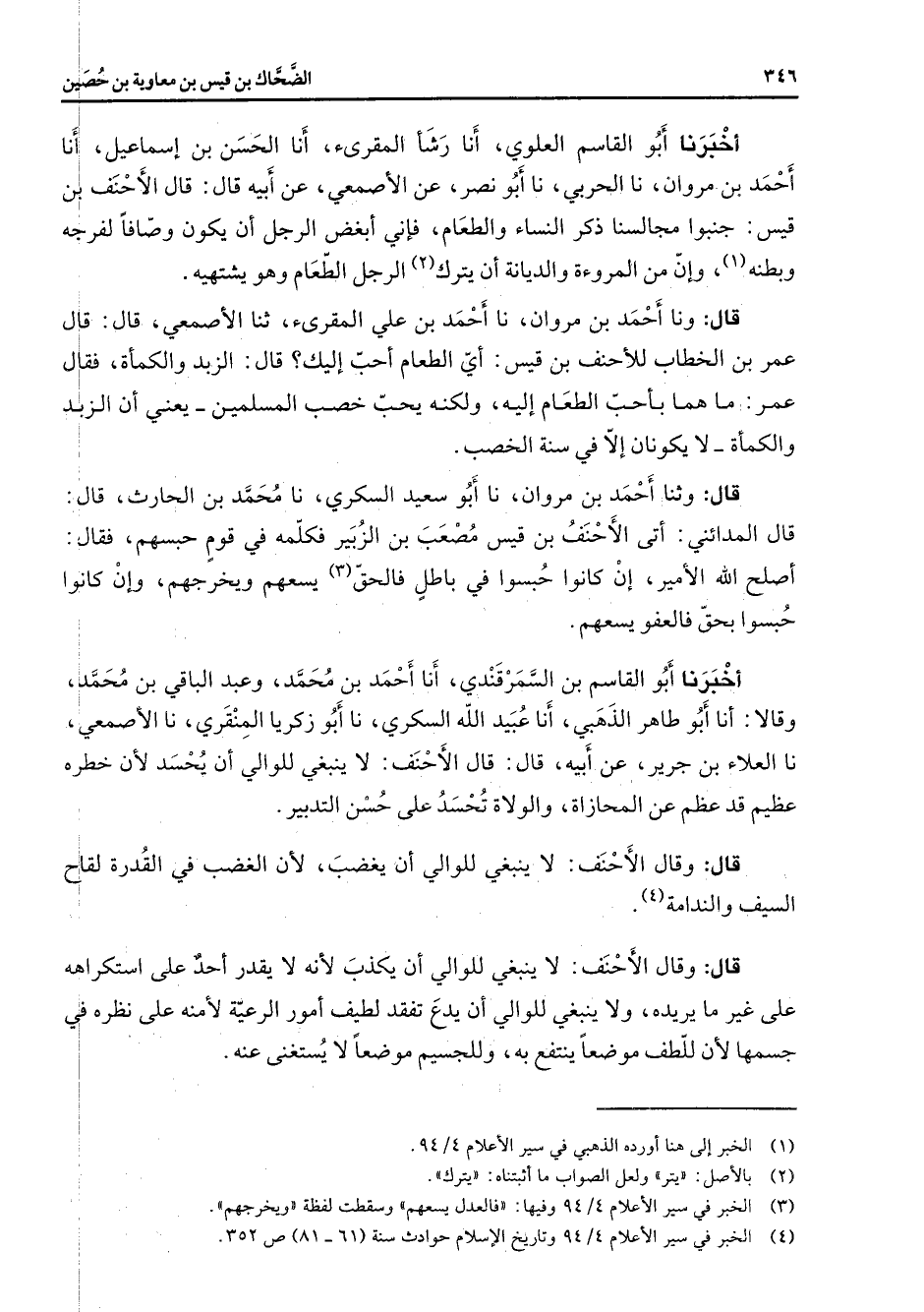 أخبرنا أبو القاسم العلوي أنا رشأ المقرئ أنا الحسن بن إسماعيل أنا أحمد بن مروان نا الحربي نا أبو نصر عن الأصمعي عن أبيه قال قال الأحنف بن قيس جنبوا مجالسنا ذكر النساء والطعام فإني أبغض الرجل أن يكون وصافا لفرجه وبطنه (1) وإن من المروءة والديانة أن يترك (2) الرجل الطعام وهو يشتهيه قال ونا أحمد بن مروان نا أحمد بن علي المقرئ ثنا الأصمعي قال قال عمر بن الخطاب للأحنف بن قيس أي الطعام أحب إليك قال الزبد والكمأة فقال عمر ما هما بأحب الطعام إليه ولكنه يحب خصب المسلمين يعني أن الزبد والكمأة لا يكونان إلا في سنة الخصب قال وثنا أحمد بن مروان نا أبو سعيد السكري نا محمد بن الحارث قال قال المدائني أتى الأحنف بن قيس مصعب بن الزبير فكلمه في قوم حبسهم فقال أصلح الله الأمير إن كانوا حبسوا في باطل فالحق يسعهم ويخرجهم وإن كانوا حبسوا بحق فالعفو يسعهم أخبرنا أبو القاسم بن السمرقندي أنا أحمد بن محمد وعبد الباقي بن محمد وقالا أنا أبو طاهر الذهبي أنا عبيد الله السكري نا أبو زكريا المنقري نا الأصمعي نا العلاء بن جرير عن أبيه قال قال الأحنف لا ينبغي للوالي أن يحسد لأن خطره عظيم قد عظم من المحازاة والولاة تحسد على حسن التدبير قال وقال الأحنف لا ينبغي للوالي أن يغضب لأن الغضب في القدرة لقاح السيف والندامة (4)