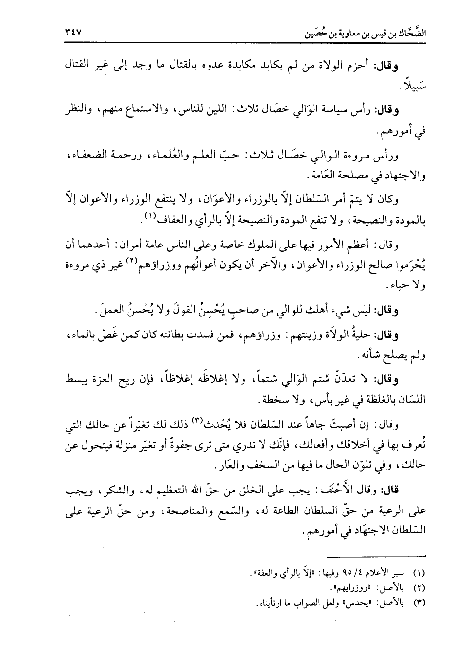 وقال أحزم الولاة من لم يكابد مكابدة عدوه بالقتال ما وجد إلى غير القتال سبيلا وقال رأس سياسة الوالي خصال ثلاث اللين للناس والاستماع منهم والنظر في أمورهم ورأس مروءة الوالي خصال ثلاث حب العلم والعلماء ورحمة الضعفاء والاجتهاد في مصلحة العامة وكان لا يتم أمر السلطان إلا بالوزراء والأعوان ولا ينتفع الوزراء والأعوان إلا بالمودة والنصيحة ولا تنفع المودة والنصيحة إلا بالرأي والعفاف (1)