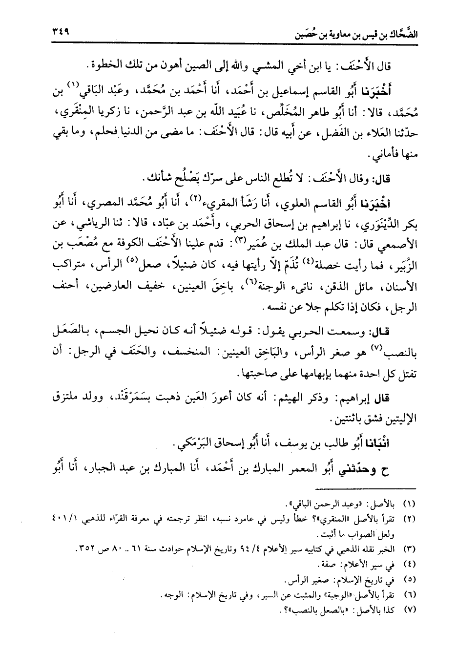 قال الأحنف يا ابن أخي المشي والله إلى الصين أهون من تلك الخطوة أخبرنا أبو القاسم إسماعيل بن أحمد أنا أحمد بن محمد وعبد الباقي (1) بن محمد قالا أنا أبو طاهر المخلص نا عبيد الله بن عبد الرحمن نا زكريا المنقري حدثنا العلاء بن الفضل عن أبيه قال قال الأحنف ما مضى من الدنيا فحلم وما بقي منها فأماني قال وقال الأحنف لا تطلع الناس على سرك يصلح شأنك أخبرنا أبو القاسم العلوي أنا رشأ المقرئ (2) أنا أبو محمد المصري أنا أبو بكر الدينوري نا إبراهيم بن إسحاق الحربي وأحمد بن عياد قالا ثنا الرياشي عن الأصمعي قال قال عبد الملك بن عمير (3) : قدم علينا الأحنف الكوفة مع مصعب بن الزبير فما رأيت خصلة (4) تذم إلا رأيتها فيه كان ضئيلا صعل (5) الرأس متراكب الأسنان مائل الذقن ناتئ الوجنة (6) باخق العينين خفيف العارضين أحنف الرجل فكان إذا تكلم جلا عن نفسه قال وسمعت الحربي يقول قوله ضئيلا أنه كان نحيل الجسم بالصعل بالنصب (7) هو صغر الرأس والباخق العينين المنخسف والحنف في الرجل أن تفتل كل واحدة منهما بإبهامها على صاحبتها قال إبراهيم وذكر الهيثم أنه كان أعور العين ذهبت بسمرقند وولد ملتزق الإليتين فشق باثنتين أنبأنا أبو طالب بن يوسف أنا أبو إسحاق البرمكي ح وحدثني أبو المعمر المبارك بن أحمد أنا المبارك بن عبد الجبار أنا أبو