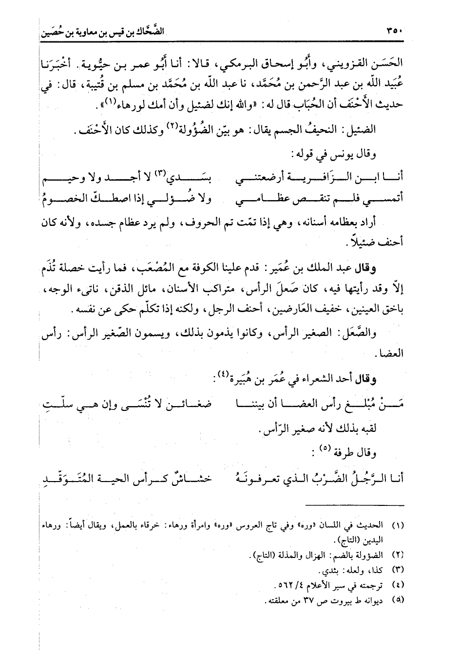 الضئيل النحيف الجسم يقال هو يبن الضؤولة (2) وكذلك كان الأحنف وقال يونس في قوله: * أنا ابن الزافرية أرضعتني * بسدي (3) لا أجد ولا وحيم أتمسي فلم تنقص عظامي * ولا ضؤلي إذا اصطك الخصوم * أراد بعظامه أسنانه وهي إذا تمت تم الحروف ولم يرد عظام جسده ولأنه كان أحنف ضئيلا وقال عبد الملك بن عمير قدم علينا الكوفة مع المصعب فما رأيت خصلة تذم إلا وقد رأيتها فيه كان صعل الرأس متراكب الأسنان مائل الذقن ناتئ الوجه باخق العينين خفيف العارضين أحنف الرجل ولكنه إذا تكلم حكى عن نفسه والعصل الصغير الرأس وكانوا يذمون بذلك ويسمون الصغير الرأس رأس العضا وقال أحد الشعراء في عمر بن هبيرة (4) : * من مبلغ رأس العضا أن بيننا * ضغائن لا تنسى وإن هي سلت * لقبه بذلك لأنه صغير الرأس وقال طرفة (5) : * أنا الرجل الضرب الذي تعرفونه * خشاش كرأس الحية المتوقد *