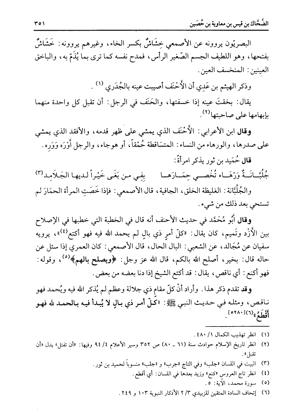 وقال ابن الأعرابي الأحنف الذي يمشي على ظهر قدمه والأفقد الذي يمشي على صدرها والورهاء من النساء المتساقطة حمقا أو هوجاء والرجل أوره ووره قال حميد بن ثور يذكر امرأة: * جلبانة ورهاء تخصي حمارها * بفي من بغى خيرا لديها الجلامد (3) * والجلبانة الغليظة الخلق الجافية قال الأصمعي فإذا خصت المرأة الحمار لم تستحي بعد ذلك من شئ وقال أبو محمد في حديث الأحنف أنه قال في الخطبة التي خطبها في الإصلاح بين الأزد وتميم كان يقال كل أمر ذي بال لم يحمد الله فيه فهو أكتع (4) يرويه سفيان عن مجالد عن الشعبي البال الحال قال الأصمعي كان العمري إذا سئل عن جاله قال بخير أصلح الله بالكم قال الله عز وجل " ويصلح بالهم (5) " وقوله فهو أكنع أي ناقص يقال قد أكتع الشيخ إذا دنا بعضه من بعض وقد تقدم ذكر هذا وأراد أن كل مقام ذي جلالة وعظم لم يذكر الله فيه ويحمد فهو ناقص ومثله في حديث النبي (صلى الله عليه وسلم) كل أمر ذي بال لا يبدأ فيه بالحمد لله فهو أقطع (6)