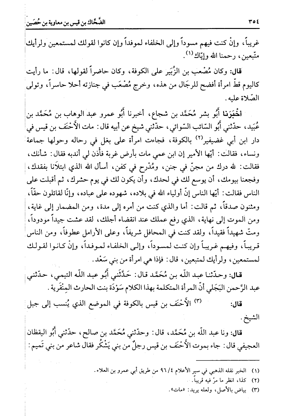 قال وكان مصعب بن الزبير على الكوفة وكان حاضرا لقولها قال ما رأيت كاليوم قط امرأة أفضح للرجال من هذه خرج مصعب في جنازته أحلا حاسرا وتولى الصلاة عليه أخبرنا أبو بشر محمد بن شجاع أخبرنا أبو عمرو عبد الوهاب بن محمد بن عبيد حدثني أبو السائب السوائي حدثني شيخ عن أبيه قال مات الأحنف بن قيس في دار ابن أبي غصيفير (2) بالكوفة فجاءت امرأة على بغل في رحاله وحولها جماعة ونساء فقالت أيها الأمير إن ابن عمي مات بأرض غربة فأذن لي أندبه فقال شأنك فقالت لله درك من مجن في جنن ومدرج في كفن أسأل الله الذي ابتلانا بفقدك وفجعنا بيومك أن يوسع لك في لحدك وأن يكون لك في يوم حشرك ثم أقبلت على الناس فقالت أيها الناس إن أولياء الله في بلاده شهوده على عباده وإنا لقائلون حقا ومثنون صدقا ثم قالت أما والذي كنت من أمره إلى مدة ومن المضمار إلى غاية ومن الموت إلى نهاية الذي رفع عملك عند انقضاء أجلك لقد عشت جيدا مودودا ومت شهيدا فقيدا ولقد كنت في المحافل شريفا وعلى الأرامل عطوفا ومن الناس قريبا وفيهم غريبا وإن كنت لمسودا وإلى الخلفاء لموفدا وإن كانوا لقولك لمستمعين ولرأيك لمتبعين قال فإذا هي امرأة من بني سعد قال وحدثنا عبد الله بن محمد قال حدثني أبو عبد الله التيمي حدثني عبد الرحمن البجلي أن المرأة المتكلمة بهذا الكلام سودة بنت الحارث المنقرية قال (3) الأحنف بن قيس بالكوفة في الموضع الذي ينسب إلى جبل الشيخ قال ونا عبد الله بن محمد قال وحدثني محمد بن صالح حدثني أبو اليقظان العجيفي قال جاء بموت الأحنف بن قيس رجل من بني يشكر فقال شاعر من بني تميم: