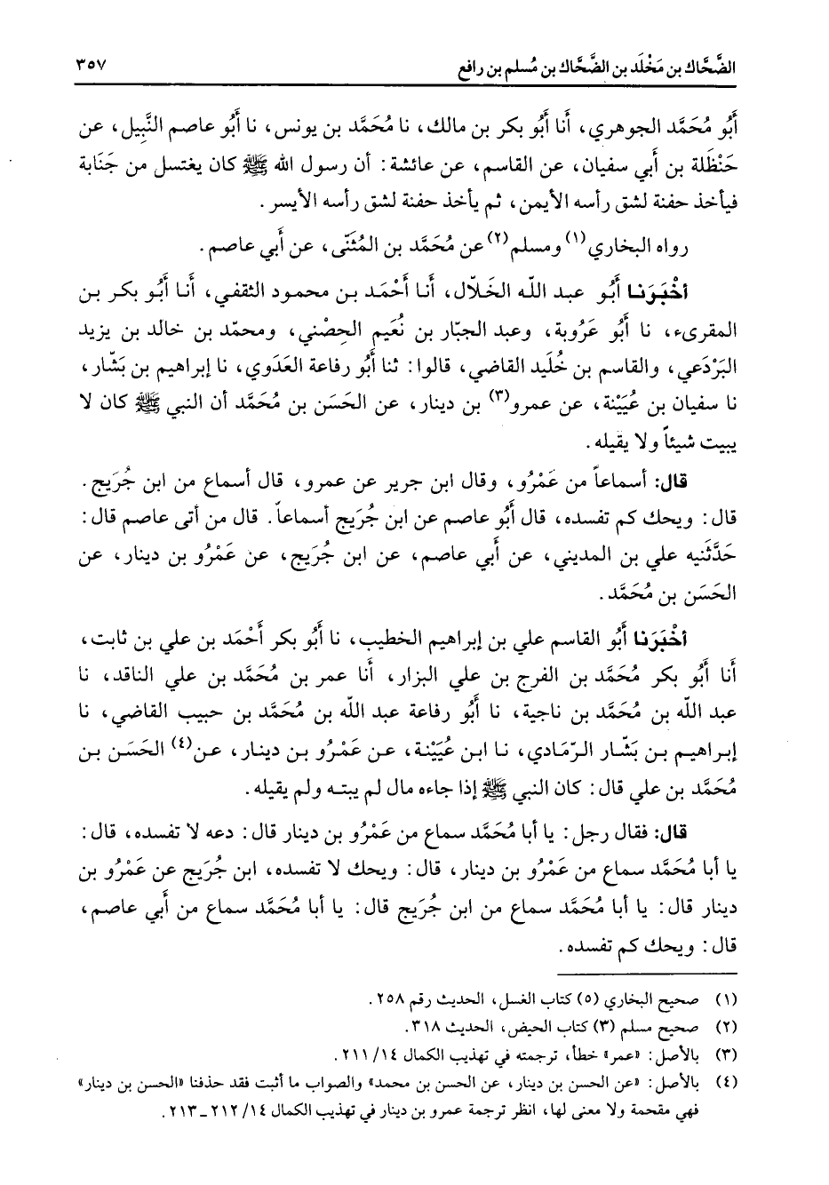أبو محمد الجوهري أنا أبو بكر بن مالك نا محمد بن يونس نا أبو عاصم النبيل عن حنظلة بن أبي سفيان عن القاسم عن عائشة أن رسول الله (صلى الله عليه وسلم) كان يغتسل من جنابة فيأخذ حفنة لشق رأسه الأيمن ثم يأخذ حفنة لشق رأسه الأيسر رواه البخاري (1) ومسلم (2) عن محمد بن المثنى عن أبي عاصم أخبرنا أبو عبد الله الخلال أنا أحمد بن محمود الثقفي أنا أبو بكر بن المقرئ نا أبو عروبة وعبد الجبار بن نعيم الحصني ومحمد بن خالد بن يزيد البردعي والقاسم بن خليد القاضي قالوا ثنا أبو رفاعة العدوي نا إبراهيم بن بشار نا سفيان بن عيينة عن عمرو (3) بن دينار عن الحسن بن محمد أن النبي (صلى الله عليه وسلم) كان لا يبيت شيئا ولا يقيله قال أسماعا من عمرو وقال ابن جرير عن عمرو قال أسماع من ابن جريج قال ويحك كم تفسده قال أبو عاصم عن ابن جريج أسماعا قال من أتى عاصم قال حدثنيه علي بن المديني عن أبي عاصم عن ابن جريج عن عمرو بن دينار عن الحسن بن محمد أخبرنا أبو القاسم علي بن إبراهيم الخطيب نا أبو بكر أحمد بن علي بن ثابت أنا أبو بكر محمد بن الفرج بن علي البزار أنا عمر بن محمد بن علي الناقد نا عبد الله بن محمد بن ناجية نا أبو رفاعة عبد الله بن محمد بن حبيب القاضي نا إبراهيم بن بشار الرمادي نا ابن عيينة عن عمرو بن دينار عن (4) الحسن بن محمد بن علي قال كان النبي (صلى الله عليه وسلم) إذا جاءه مال لم يبته ولم يقيله قال فقال رجل يا أبا محمد سماع من عمرو بن دينار قال دعه لا تفسده قال يا أبا محمد سماع من عمرو بن دينار قال ويحك لا تفسده ابن جريج عن عمرو بن دينار قال يا أبا محمد سماع من ابن جريج قال يا أبا محمد سماع من أبي عاصم قال ويحك كم تفسده