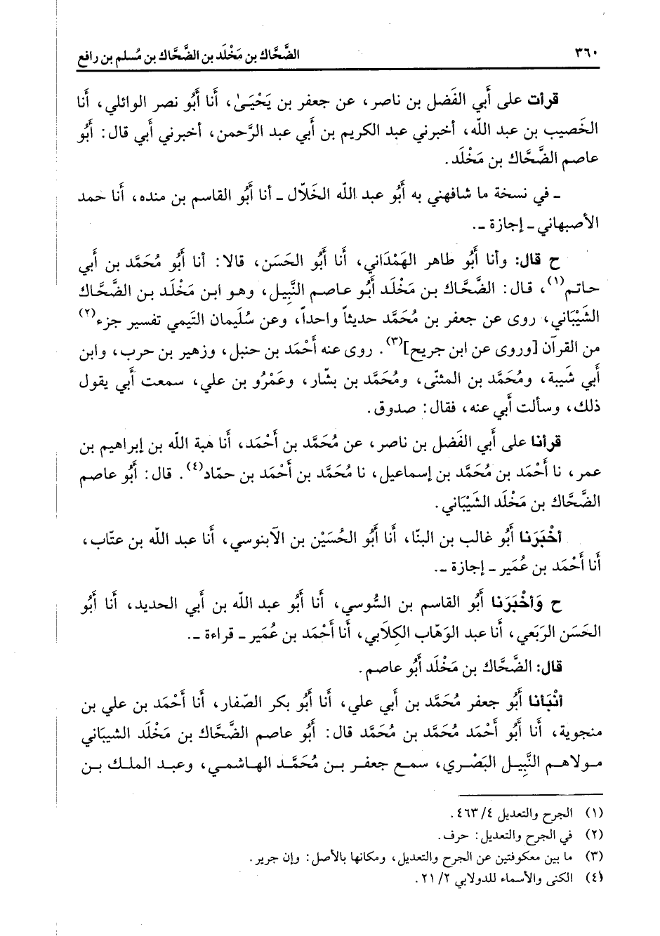 قال أبو عاصم الضحاك بن مخلد الشيباني أخبرنا أبو غالب بن البنا أنا أبو الحسين بن الآبنوسي أنا عبد الله بن عتاب أنا أحمد بن عمير إجازة ح وأخبرنا أبو القاسم بن السوسي أنا أبو عبد الله بن أبي الحديد أنا أبو الحسن الربعي أنا عبد الوهاب الكلابي أنا أحمد بن عمير قراءة قال الضحاك بن مخلد أبو عاصم أنبأنا أبو جعفر محمد بن أبي علي أنا أبو بكر الصفار أنا أحمد بن علي بن منجوية أنا أبو أحمد محمد بن محمد قال أبو عاصم الضحاك بن مخلد الشيباني مولاهم النبيل البصري سمع جعفر بن محمد الهاشمي وعبد الملك بن