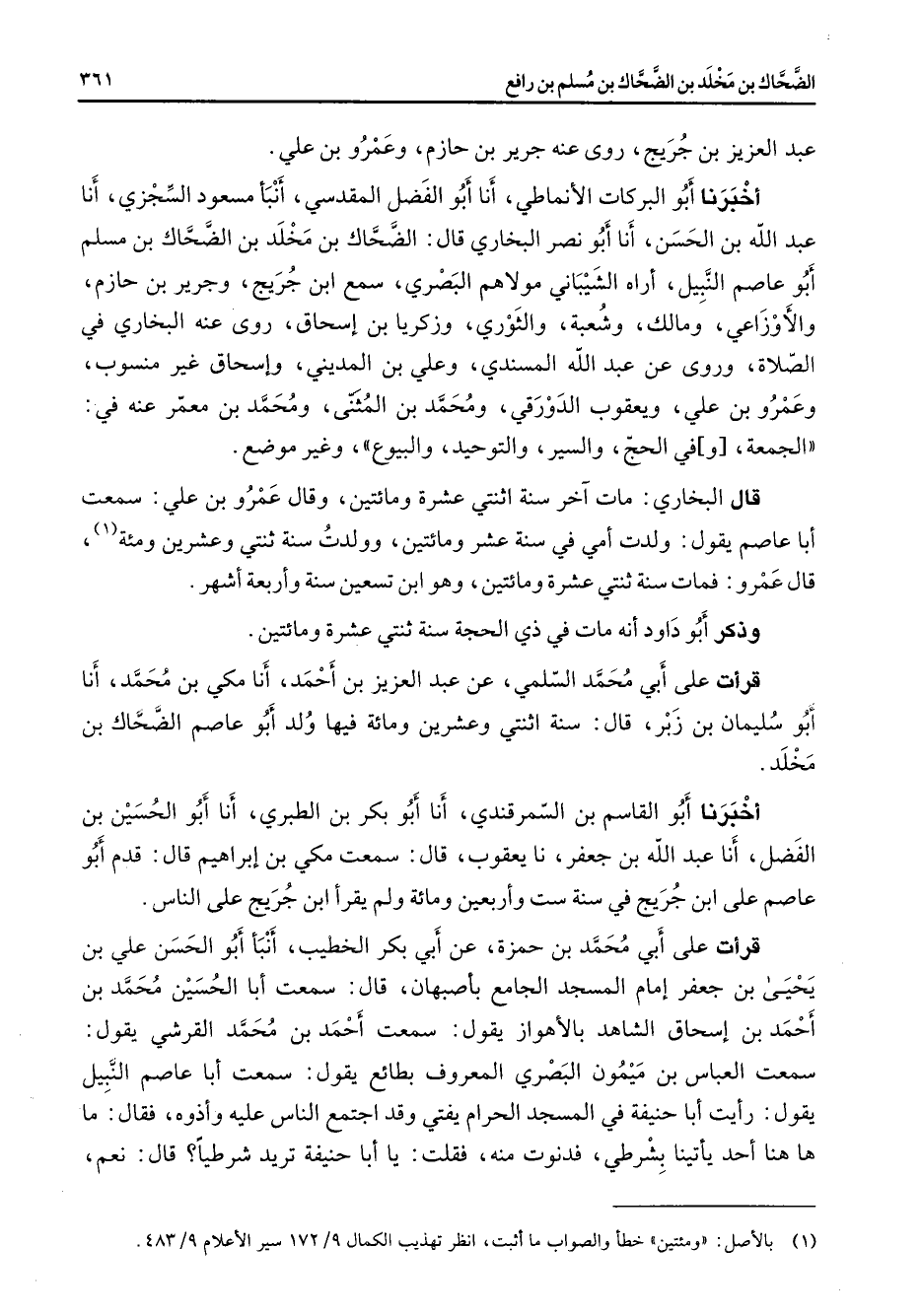 عبد العزيز بن جريج روى عنه جرير بن حازم وعمرو بن علي أخبرنا أبو البركات الأنماطي أنا أبو الفضل المقدسي أنبأ مسعود السجزي أنا عبد الله بن الحسن أنا أبو نصر البخاري قال الضحاك بن مخلد بن الضحاك بن مسلم أبو عاصم النبيل أراه الشيباني مولاهم البصري سمع ابن جريج وجرير بن حازم والأوزاعي ومالك وشعبة والثوري وزكريا بن إسحاق روى عنه البخاري في الصلاة وروى عن عبد الله المسندي وعلي بن المديني وإسحاق غير منسوب وعمرو بن علي ويعقوب الدورقي ومحمد بن المثنى ومحمد بن معمر عنه في الجمعة وفي الحج والسير والتوحيد والبيوع وغير موضع قال البخاري مات آخر سنة اثنتي عشرة ومائتين وقال عمرو بن علي سمعت أبا عاصم يقول ولدت أمي في سنة عشر ومائتين وولدت سنة ثنتي وعشرين ومئة (1) قال عمرو فمات سنة ثنتي عشرة ومائتين وهو ابن تسعين سنة وأربعة أشهر وذكر أبو داود أنه مات في ذي الحجة سنة ثنتي عشرة ومائتين قرأت على أبي محمد السلمي عن عبد العزيز بن أحمد أنا مكي بن محمد أنا أبو سليمان بن زبر قال سنة اثنتي وعشرين ومائة فيها ولد أبو عاصم الضحاك بن مخلد أخبرنا أبو القاسم بن السمرقندي أنا أبو بكر بن الطبري أنا أبو الحسين بن الفضل أنا عبد الله بن جعفر نا يعقوب قال سمعت مكي بن إبراهيم قال قدم أبو عاصم على ابن جريج في سنة ست وأربعين ومائة ولم يقرأ ابن جريج على الناس قرأت على أبي محمد بن حمزة عن أبي بكر الخطيب أنبأ أبو الحسن علي بن يحيى بن جعفر إمام المسجد الجامع بأصبهان قال سمعت أبا الحسين محمد بن أحمد بن إسحاق الشاهد بالأهواز يقول سمعت أحمد بن محمد القرشي يقول سمعت العباس بن ميمون البصري المعروف بطائع يقول سمعت أبا عاصم النبيل يقول رأيت أبا حنيفة في المسجد الحرام يفتي وقد اجتمع الناس عليه وأذوه فقال ما ها هنا أحد يأتينا بشرطي فدنوت منه فقلت يا أبا حنيفة تريد شرطيا قال نعم