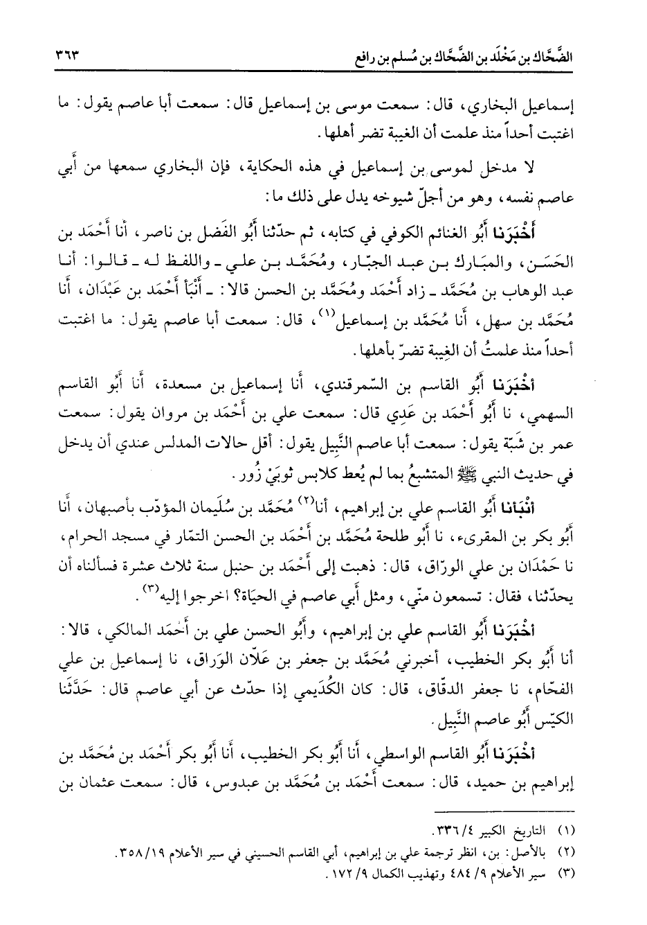 إسماعيل البخاري قال سمعت موسى بن إسماعيل قال سمعت أبا عاصم يقول ما اغتبت أحدا منذ علمت أن الغيبة تضر أهلها لا مدخل لموسى بن إسماعيل في هذه الحكاية فإن البخاري سمعها من أبي عاصم نفسه وهو من أجل شيوخه يدل على ذلك ما أخبرنا أبو الغنائم الكوفي في كتابه ثم حدثنا أبو الفضل بن ناصر أنا أحمد بن الحسن والمبارك بن عبد الجبار ومحمد بن علي واللفظ له قالوا أنا عبد الوهاب بن محمد زاد أحمد ومحمد بن الحسن قالا أنبأ أحمد بن عبدان أنا محمد بن سهل أنا محمد بن إسماعيل (1) قال سمعت أبا عاصم يقول ما اغتبت أحدا منذ علمت أن الغيبة تضر بأهلها أخبرنا أبو القاسم بن السمرقندي أنا إسماعيل بن مسعدة أنا أبو القاسم السهمي نا أبو أحمد بن عدي قال سمعت علي بن أحمد بن مروان يقول سمعت عمر بن شبة يقول سمعت أبا عاصم النبيل يقول أقل حالات المدلس عندي أن يدخل في حديث النبي (صلى الله عليه وسلم) المتشبع بما لم يعط كلابس ثوبي زور أنبأنا أبو القاسم علي بن إبراهيم أنا محمد بن سليمان المؤدب بأصبهان أنا أبو بكر بن المقرئ نا أبو طلحة محمد بن أحمد بن الحسن التمار في مسجد الحرام نا حمدان بن علي الوراق قال ذهبت إلى أحمد بن حنبل سنة ثلاث عشرة فسألناه أن يحدثنا فقال تسمعون مني ومثل أبي عاصم في الحياة اخرجوا إليه (3)