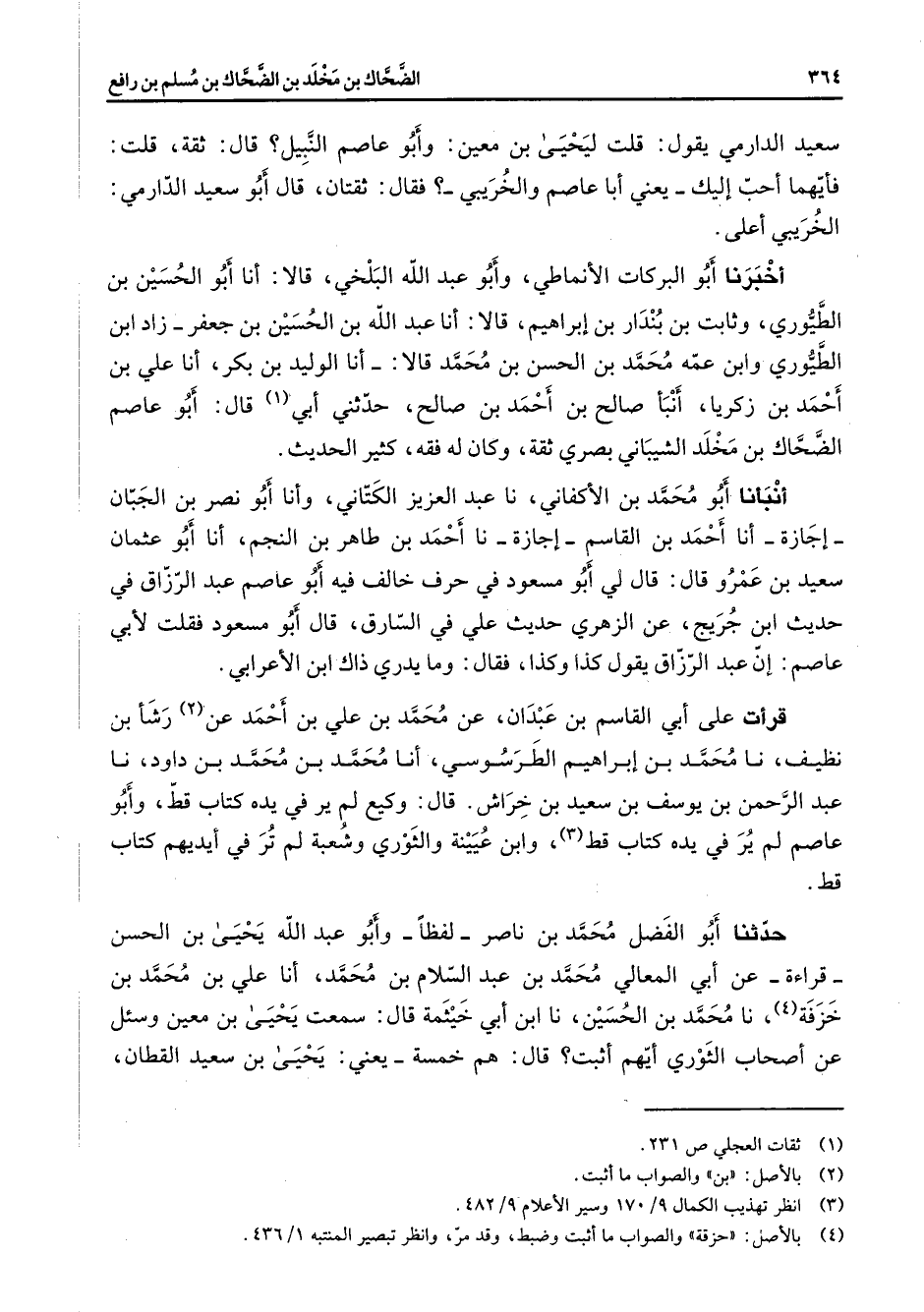 سعيد الدارمي يقول قلت ليحيى بن معين وأبو عاصم النبيل قال ثقة قلت فأيهما أحب إليك يعني أبا عاصم والخريبي قال ثقتان قال أبو سعيد الدارمي الخريبي أعلى أخبرنا أبو البركات الأنماطي وأبو عبد الله البلخي قالا أنا أبو الحسين بن الطيوري وثابت بن بندار بن إبراهيم قالا أنا عبد الله بن الحسين بن جعفر زاد ابن الطيوري وابن عمه محمد بن الحسن بن محمد قالا أنا الوليد بن بكر أنا علي بن أحمد بن زكريا أنبأ صالح بن أحمد بن صالح حدثني أبي (1) قال أبو عاصم الضحاك بن مخلد الشيباني بصري ثقة وكان له فقه كثير الحديث أنبأنا أبو محمد بن الأكفاني نا عبد العزيز الكتاني وأنا أبو نصر بن الجبان إجازة أنا أحمد بن القاسم إجازة نا أحمد بن طاهر بن النجم أنا أبو عثمان سعيد بن عمرو قال قال لي أبو مسعود في حرف خالف فيه أبو عاصم عبد الرزاق في حديث ابن جريج عن الزهري حديث علي في السارق قال أبو مسعود فقلت لأبي عاصم إن عبد الرزاق يقول كذا وكذا فقال وما يدري ذاك ابن الأعرابي قرأت على أبي القاسم بن عبدان عن محمد بن علي بن أحمد عن (2) رشأ بن نظيف نا محمد بن إبراهيم الطرسوسي أنا محمد بن محمد بن داود نا عبد الرحمن بن يوسف بن سعيد بن خراش قال وكيع لم ير في يده كتاب قط وأبو عاصم لم ير في يده كتاب قط (3) وابن عيينة والثوري وشعبة تر في أيديهم كتاب قط حدثنا أبو الفضل محمد بن ناصر لفظا وأبو عبد الله يحيى بن الحسن قراءة عن أبي المعالي محمد بن عبد السلام بن محمد أنا علي بن محمد بن خزفة (4) نا محمد بن الحسين نا ابن خيثمة قال سمعت يحيى بن معين وسئل عن أصحاب الثوري أيهم أثبت قال هم خمسة يعني يحيى بن سعيد القطان
