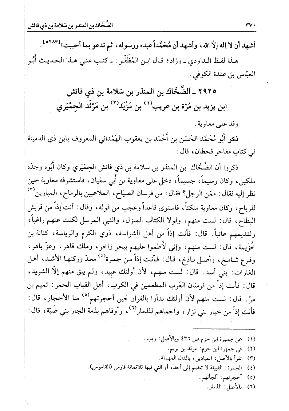 2925 - الضحاك بن المنذر بن سلامة بن ذي فائش ابن يزيد بن مرة بن عريب (1) بن مزيد (2) بن مرثد الحميري وفد على معاوية ذكر أبو محمد الحسن بن أحمد بن يعقوب الهمداني المعروف بابن ذي الدمينة في كتاب مفاخر قحطان قال ذكروا أن الضحاك بن المنذر بن سلامة بن ذي فائش الحميري وكان أبوه وجده ملكين وكان وسيما جسيما دخل على معاوية بن أبي سفيان فاستشرفه معاوية حين نظر إليه فقال ممن الرجل فقال من فرسان الصياح الملاعبين بالرماح المبارين (3) للرياح وكان معاوية متكئا فاستوى قاعدا وعجب من قوله وقال أنت إذا من قريش البطاح قال لست منهم ولولا الكتاب المنزل والنبي المرسل لكنت عنهم راغبا ولقديمهم عائبا قال فأنت إذا من أهل الشراسة ذوي الكرم والرياسة كنانة بن خزيمة قال لست منهم وإني لأطموا عليهم ببحر زاخر وملك قاهر وعز باهر وفرع شامخ وأصل باذخ قال فأنت إذا من جمرة (4) معد وركنها الأشد أهل الغارات بني أسد قال لست منهم لأن أولئك عبيد ولم يبق منهم إلا الشريد قال فأنت إذا من فرسان العرب المطعمين في الكرب أهل القباب الحمر تميم بن مر قال لست منهم لأن أولئك بدأوا بالفرار حين أحجرتهم (5) منا الأحجار قال فأنت إذا من خيار بني نزار وأحماهم للذمار (6) إذا من خيار بني نزار وأحماهم للذمار وأوفاهم بذمة الجار بني ضبة قال