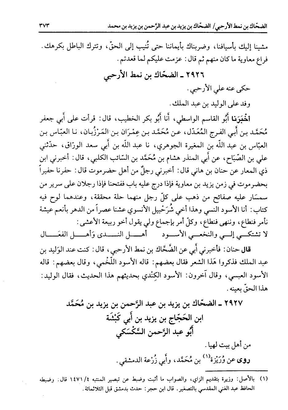 2926 - الضحاك بن نمط الأرحبي حكى عنه علي الأرحبي وفد على الوليد بن عبد الملك أخبرنا أبو القاسم الواسطي أنا أبو بكر الخطيب قال قرأت على أبي جعفر محمد بن أبي الفرج المعدل عن محمد بن عمران بن المرزبان نا العباس بن العباس بن عبد الله بن المغيرة الجوهري نا عبد الله بن أبي سعد الوراق حدثني علي بن الصباح عن أبي المنذر هشام بن محمد بن السائب الكلبي قال أخبرني ابن ذي المعار عن حنان بن هاني قال أخبرني رجل من أهل حضرموت قال حفرنا حفيرا بحضرموت في زمن يزيد بن معاوية فإذا درج عليه باب ففتحنا فإذا رجلان على سرير من سمسار عليه صفائح من ذهب على كل رجل منهما حلة محققة وعندهما لوح فيه كتاب أنا الأسود النسي وهذا أخي شرحبيل الأنسوي عشنا عصرا من الدهر بأنهم عيشة نأمر فنطاع وننهى فنطاع وكل أمر بإجماع ولي يقول أخو ربيعة الأعشى: * لا تشتكي إلي والنخعي الأسود * أهل الندى وأهل الفعال * قال حنان فأخبرني أبي عن الضحاك بن نمط الأرحبي قال كنت عند الوليد بن عبد الملك فذكروا هذا الشعر فقال بعضهم قال الأسود اللخمي وقال بعضهم قاله الأسود العبسي وقال آخرون الأسود الكندي بحديثهم هذا الحديث فقال الوليد هذا الحق بعينه