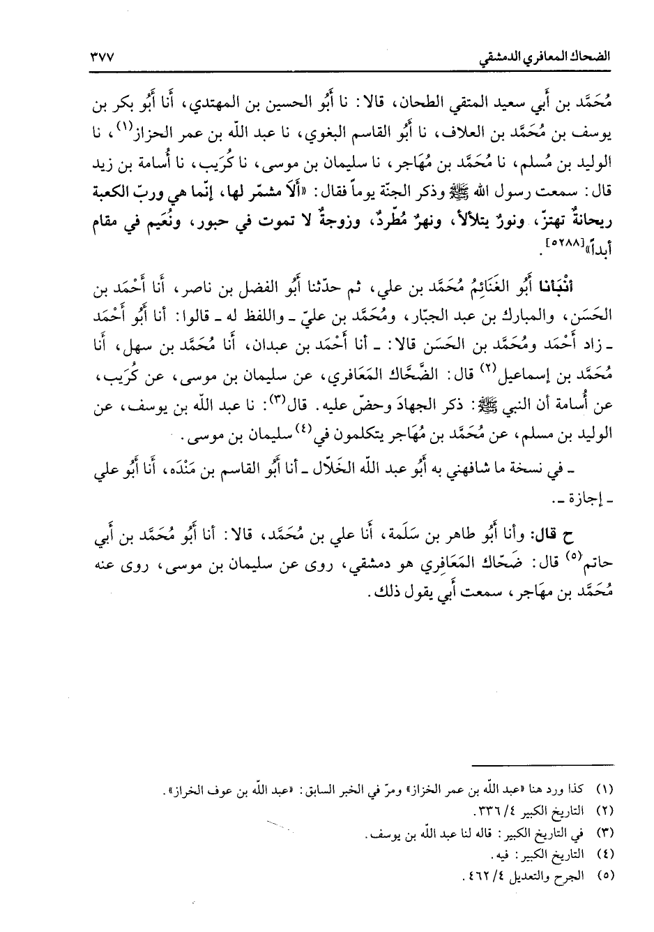 محمد بن أبي سعيد المتقي الطحان قالا نا أبو الحسين بن المهتدي أنا أبو بكر بن يوسف بن محمد بن العلاف نا أبو القاسم البغوي نا عبد الله بن عمر الجزاز (1) نا الوليد بن مسلم نا محمد بن مهاجر نا سليمان بن موسى نا كريب نا أسامة بن زيد قال سمعت رسول الله (صلى الله عليه وسلم) وذكر الجنة يوما فقال ألا مشمر لها إنما هي ورب الكعبة ريحانة تهتز ونور يتلألأ ونهر مطرد وزوجة لا تموت في حبور ونعيم في مقام أبدا أنبأنا أبو الغنائم محمد بن علي ثم حدثنا أبو الفضل بن ناصر أنا أحمد بن الحسن والمبارك بن عبد الجبار ومحمد بن علي واللفظ له قالوا أنا أبو أحمد زاد أحمد ومحمد بن الحسن قالا أنا أحمد بن عبدان أنا محمد بن سهل أنا محمد بن إسماعيل (2) قال الضحاك المعافري عن سليمان بن موسى عن كريب عن أسامة أن النبي (صلى الله عليه وسلم) ذكر الجهاد وحض عليه قال (3) : نا عبد الله بن يوسف عن الوليد بن مسلم عن محمد بن مهاجر يتكلمون في (4) سليمان بن موسى في نسخة ما شافهني به أبو عبد الله الخلال أنا أبو القاسم بن منده أنا أبو علي إجازة ح قال وأنا أبو طاهر بن سلمة أنا علي بن محمد قالا أنا أبو محمد بن أبي حاتم (5) قال ضحاك المعافري هو دمشقي روى عن سليمان بن موسى روى عنه محمد بن مهاجر سمعت أبي يقول ذلك
