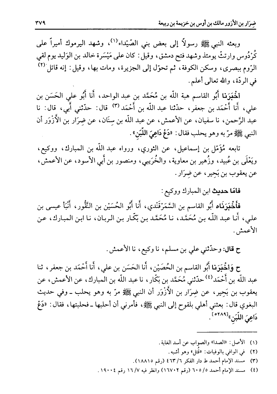 وبعثه النبي (صلى الله عليه وسلم) رسولا إلى بعض بني الصيداء (1) وشهد اليرموك أميرا على كردوس وارتث يومئذ وشهد فتح دمشق وقيل كان على ميسرة خالد بن الوليد يوم لقي الروم ببصرى وسكن الكوفة ثم تحول إلى الجزيرة ومات بها وقيل إنه قاتل (2) في الردة والله تعالى أعلم أخبرنا أبو القاسم هبة الله بن محمد بن عبد الواحد أنا أبو علي الحسن بن علي أنا أحمد بن جعفر حدثنا عبد الله بن أحمد (3) قال حدثني أبي قال نا عبد الرحمن نا سفيان عن الأعمش عن عبد الله بن سنان عن ضرار بن الأزور أن النبي (صلى الله عليه وسلم) مر به وهو يحلب فقال دع داعي اللبن تابعه مؤمل بن إسماعيل عن الثوري ورواه عبد الله بن المبارك ووكيع ويعلى بن عبيد وزهير بن معاوية والخريبي ومنصور بن أبي الأسود عن الأعمش عن يعقوب بن بحير عن ضرار فأما حديث ابن المبارك ووكيع فأخبرناه أبو القاسم بن السمرقندي أنا أبو الحسين بن النقور أنبأ عيسى بن علي أنا عبد الله بن محمد نا محمد بن بكار بن الربان نا ابن المبارك عن الأعمش ح قال وحدثني علي بن مسلم نا وكيع نا الأعمش ح وأخبرنا أبو القاسم بن الحصين أنا الحسن بن علي أنا أحمد بن جعفر ثنا عبد الله بن أحمد (4) حدثني محمد بن بكار نا عبد الله بن المبارك عن الأعمش عن يعقوب بن بحير عن ضرار بن الأزور أن النبي (صلى الله عليه وسلم) مر به وهو يحلب وفي حديث البغوي قال بعثني أهلي بلقوح إلى النبي (صلى الله عليه وسلم) فأمرني أن أحلبها فحلبتها فقال دع داعي اللبن