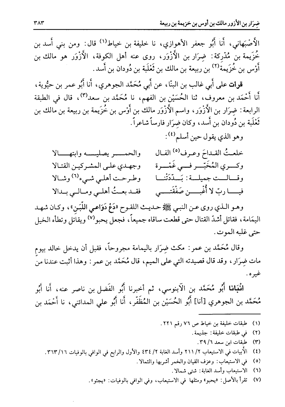 الأصبهاني أنا أبو جعفر الأهوازي نا خليفة بن خياط (1) قال ومن بني أسد بن خزيمة بن مدركة ضرار بن الأزور روى عنه أهل الكوفة الأزور هو مالك بن أوس بن خزيمة (2) بن ربيعة بن مالك بن ثعلبة بن دودان بن أسد قرات على أبي غالب بن البنا عن أبي محمد الجوهري أنا أبو عمر بن حيوية أنا أحمد بن معروف ثنا الحسين بن الفهم نا محمد بن سعد (3) قال في الطبقة الرابعة ضرار بن الأزور واسم الأزور مالك بن أوس بن خزيمة بن ربيعة بن مالك بن ثعلبة بن دودان بن أسد وكان ضرار فارسا شاعرا وهو الذي يقول حين أسلم (4) : * خلعت القداح وعرف (5) الفال * والحمر يصليه وابتهالا وكري المخبر في غمرة * وجهدي على المشركين القتال وقالت جميلة بددتنا * وطرحت أهلي شئ (6) وشالا فيا رب لا أغبن صفقتي * فقد بعت أهلي ومالي بدالا * وهو الذي روى عن النبي (صلى الله عليه وسلم) حديث اللقوح دع دواعي اللبن وكان شهد اليمامة فقاتل أشد القتال حتى قطعت ساقاه جميعا فجعل يحبو (7) ويقاتل وتطأة الخيل حتى غلبه الموت وقال محمد بن عمر مكث ضرار باليمامة مجروحا فقبل أن يدخل خالد بيوم مات ضرار وقد قال قصيدته التي على الميم قال محمد بن عمر وهذا أثبت عندنا من غيره أنبأنا أبو محمد بن الآبنوسي ثم أخبرنا أبو الفضل بن ناصر عنه أنا أبو محمد بن الجوهري أنا أبو الحسين بن المظفر أنا أبو علي المدائني نا أحمد بن