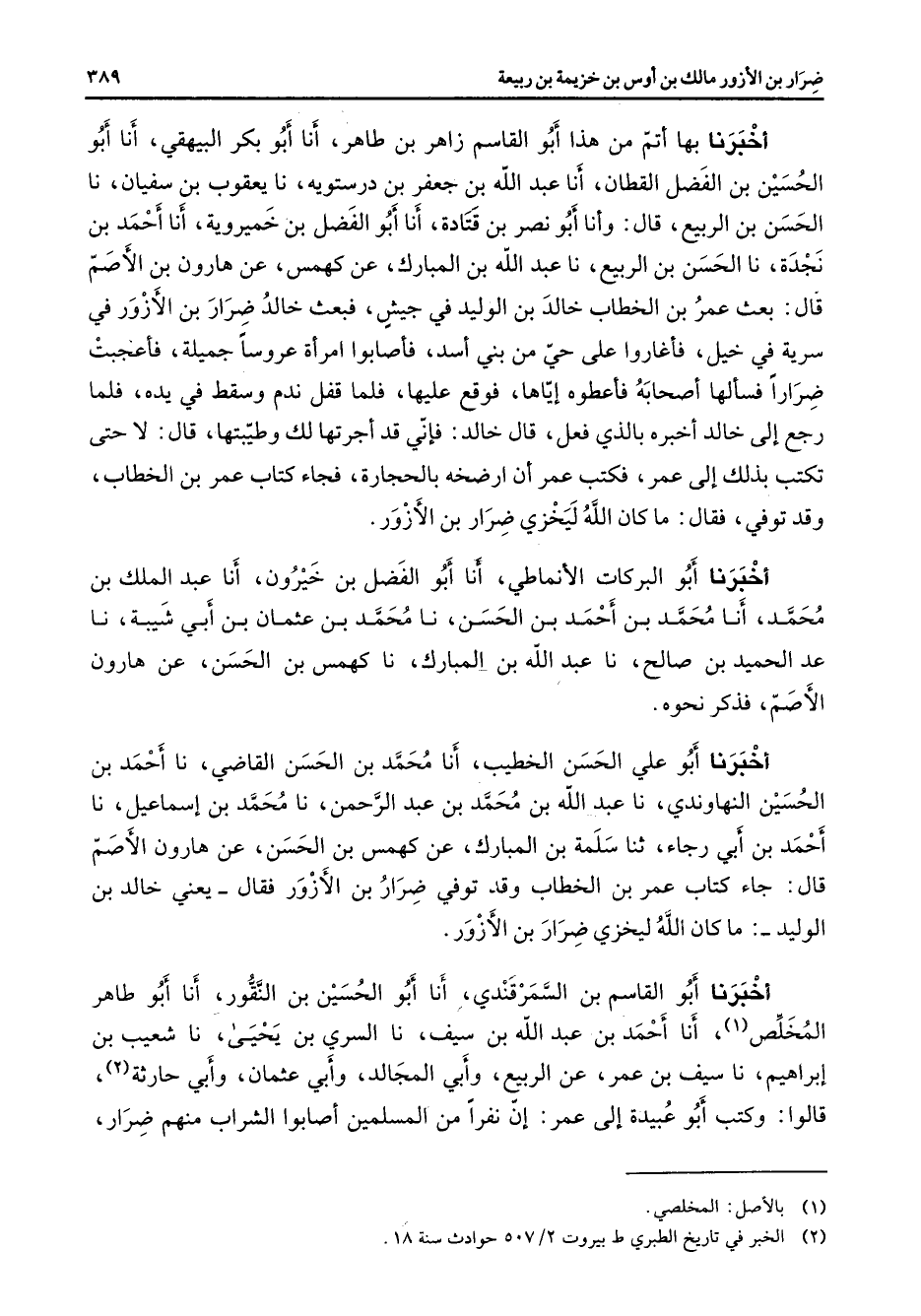 أخبرنا بها أتم من هذا أبو القاسم زاهر بن طاهر أنا أبو بكر البيهقي أنا أبو الحسين بن الفضل القطان أنا عبد الله بن جعفر بن درستويه نا يعقوب بن سفيان نا الحسن بن الربيع قال وأنا أبو نصر بن قتادة أنا أبو الفضل بن خميروية أنا أحمد بن نجدة نا الحسن بن الربيع نا عبد الله بن المبارك عن كهمس عن هارون بن الأصم قال بعث عمر بن الخطاب خالد بن الوليد في جيش فبعث فبعث خالد ضرار بن الأزور في سرية في خيل فأغاروا على حي من بني أسد فأصابوا امرأة عروسا جميلة فأعجبت ضرارا فسألها أصحابه فأعطوه إياها فوقع عليها فلما قفل ندم وسقط في يده فلما رجع إلى خالد أخبره بالذي فعل قال خالد فإني قد أجرتها لك وطيبتها قال لا حتى تكتب بذلك إلى عمر فكتب عمر أن أرضخه بالحجارة فجاء كتاب عمر بن الخطاب وقد توفي فقال ما كان الله ليخزي ضرار بن الأزور أخبرنا أبو البركات الأنماطي أنا أبو الفضل بن خيرون أنا عبد الملك بن محمد أنا محمد بن أحمد بن الحسن نا محمد بن عثمان بن أبي شيبة نا عبد الحميد بن صالح نا عبد الله بن المبارك نا كهمس بن الحسن عن هارون الأصم فذكر نحوه أخبرنا أبو علي الحسن الخطيب أنا محمد بن الحسن القاضي نا أحمد بن الحسين النهاوندي نا عبد الله بن محمد بن عبد الرحمن نا محمد بن إسماعيل نا أحمد بن أبي رجاء ثنا سلمة بن المبارك عن كهمس بن الحسن عن هارون الأصم قال جاء كتاب عمر بن الخطاب وقد توفي ضرار بن الأزور فقال يعني خالد بن الوليد ما كان الله ليخزي ضرار بن الأزور أخبرنا أبو القاسم بن السمرقندي أنا أبو الحسين بن النقور أنا أبو طاهر المخلص (1) أنا أحمد بن عبد الله بن سيف نا السري بن يحيى نا شعيب بن إبراهيم نا سيف بن عمر عن الربيع وأبي المجالد وأبي عثمان وأبي حارثة (2) قالوا كتب أبو عبيدة إلى عمر إن نفرا من المسلمين أصابوا الشراب منهم ضرار