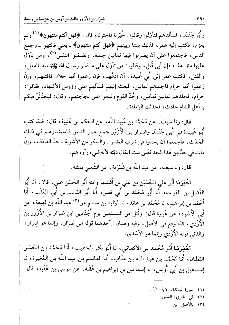 وأبو جندل فسألناهم فتأولوا وقالوا خيرنا فاخترنا قال " فهل أنتم منتهون " (1) ولم يعزم فكتب إليه عمر فذلك بيننا وبينهم " فهل أنتم منتهون " يعني فانتهوا وجمع الناس فاجتمعوا على أن يضربوا فيها ثمانين جلدة وتضمنوا النفس (2) ومن تأول عليها مثل هذا فإن أبي قتل وقالوا من تأول على ما فسر رسول الله (صلى الله عليه وسلم) منه بالفعل والقتل فكتب عمر إلى أبي عبيدة أن ادعهم فإن زعموا أنها حلال فاقتلهم وإن زعموا أنها حرام فاجلدهم ثمانين فبعث إليهم فسألهم على رؤوس الأشهاد فقالوا حرام فجلدهم ثمانين ثمانين وحد القوم وندموا على لجاجتهم وقال ليحدثن فيكم يا أهل الشام حادث فحدثت الرمادة قال ونا سيف عن محمد بن عبيد الله عن الحكم بن عتيبة قال فلما كتب أبو عبيدة في أبي جندل وضرار بن الأزور جمع عمر الناس فاستشارهم في ذلك الحدث فأجمعوا أيحدوا في شرب الخمر والسكر من الأشربة حد القاذف وإن مات في حد من هذا الحد فعلى بيت المال ديته لأنه شئ رأوه هم قال ونا سيف عن عبد الله بن شبرمة عن الشعبي بمثله أخبرنا أبو علي الحسين بن علي بن أشليها وابنه أبو الحسن علي قالا أنا أبو الفضل بن الفرات أنا أبو محمد بن أبي نصر أنا أبو القاسم بن أبي العقب أنا أحمد بن إبراهيم نا محمد بن عائد نا الوليد بن مسلم عن (3) عبد الله بن لهيعة عن أبي الأسود عن عروة قال وقتل من المسلمين يوم أجنادين ابن ضرار بن الأزور بن الأزدي كذا وقع في الأصل وفيه وهمان أحدهما قوله ابن ضرار وإنما هو ضرار والثاني قوله الأزدي وإنما هو الأسدي أخبرنا أبو محمد بن الأكفاني نا أبو بكر الخطيب أنا محمد بن الحسن القطان أنا محمد بن عبد الله بن عتاب أنا القاسم بن عبد الله بن المغيرة نا إسماعيل بن أبي أويس نا إسماعيل بن إبراهيم بن عقبة عن موسى بن عقبة قال