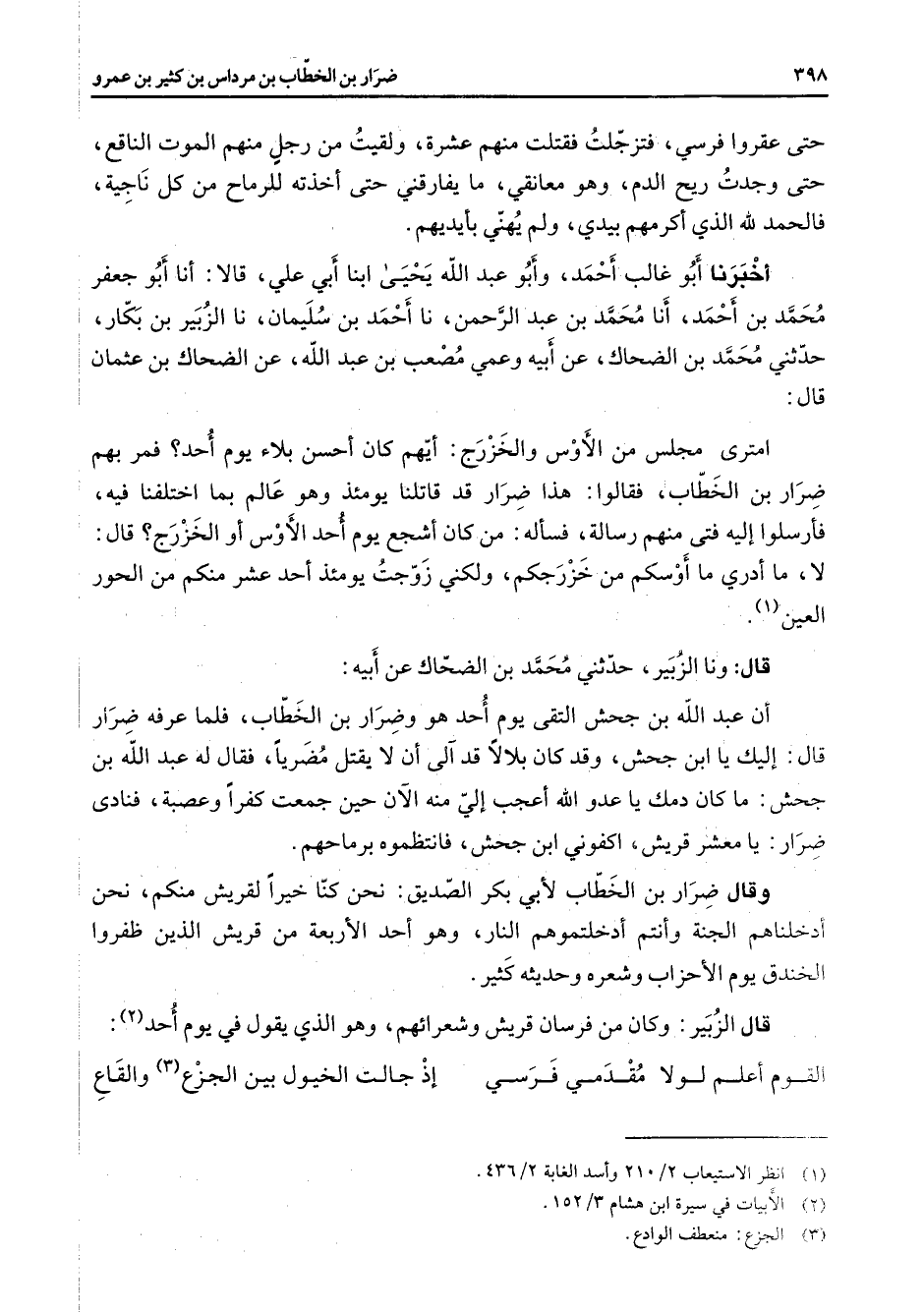 حتى عقدوا فرسي فتزجلت فقتلت منهم عشرة ولقيت من رجل منهم الموت الناقع حتى وجدت ريح الدم وهو معانقي ما يقارقني حتى أخذته للرماح من كل ناجية فالحمد لله الذي أكرمهم بيدي ولم يهني بأيديهم أخبرنا أبو غالب أحمد وأبو عبد الله يحيى ابنا أبي علي قالا أنا أبو جعفر محمد بن أحمد أنا محمد بن عبد الرحمن نا أحمد بن سليمان نا الزبير بن بكار حدثني محمد بن الضحاك عن أبيه وعمي مصعب بن عبد الله عن الضحاك بن عثمان قال امترى مجلس من الأوس والخزرج أيهم كان أحسن بلاء يوم أحد فمر بهم ضرار بن الخطاب فقالوا هذا ضرار قد قاتلنا يومئذ وهو عالم بما اختلفنا فيه فأرسلوا إليه فتى منهم رسالة فسأله من كان أشجع يوم أحد الأوس أو الخزرج قال لا ما أدري ما أوسكم من خزرجكم ولكني زوجت يومئذ أحد عشر منكم من الحور العين (1)