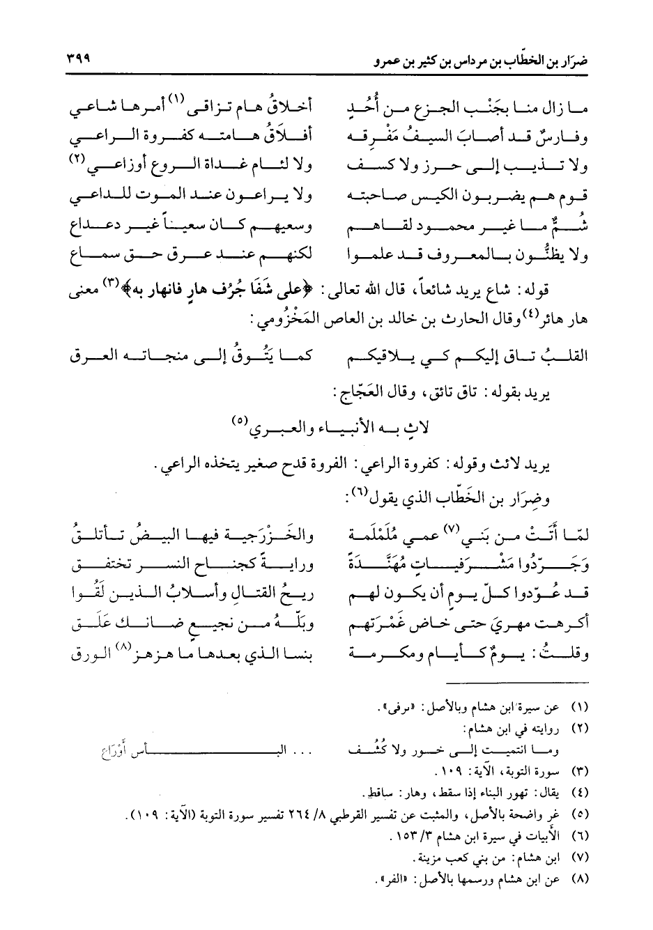 ما زال منا بجنب الجزع من أحد * أخلاق هام تزاقى (1) أمرها شاعي وفارس قد أصاب السيف مفرقه * أفلاق هامته كفروة الراعي ولا تذيب إلى حرز ولا كسف * ولا لئام غداة الروع أوزاعي (2) قوم هم يضربون الكيس صاحبته * ولا يراعون عند الموت للداعي شم ما غير محمود لقاهم * وسعيهم كان سعيا غير دعداع ولا يظنون بالمعروف قد علموا * لكنهم عند عرق حق سماع * قوله شاع يريد شائعا قال الله تعالى " على شفا جرف هار فانهار به " (3) معنى هار هائر (4) وقال الحارث بن خالد بن العاص المخزومي: * القلب تاق إليكم كي يلاقيكم * كما يتوق إلى منجاته العرق * يريد بقوله تاق تائق وقال العجاج: * لاث به الأنبياء والعبري (5) يريد لائث وقوله كفروة الراعي الفروة قدح صغير يتخذه الراعي وضرار بن الخطاب الذي يقول (6) : * لما أتت من بني (7) عمي ململمة * والخزرجية فيها البيض تأتلق وجردوا مشرفيات مهندة * وراية كجناح النسر تختفق قد عودوا كل يوم أن يكون لهم * ريح القتال وأسلاب الذين لقوا أكرهت مهري حتى خاض غمرتهم * وبله من نجيع ضانك علق وقلت يوم كأيام ومكرمة * بنسا الذي بعدها ما هزهز (8) الورق