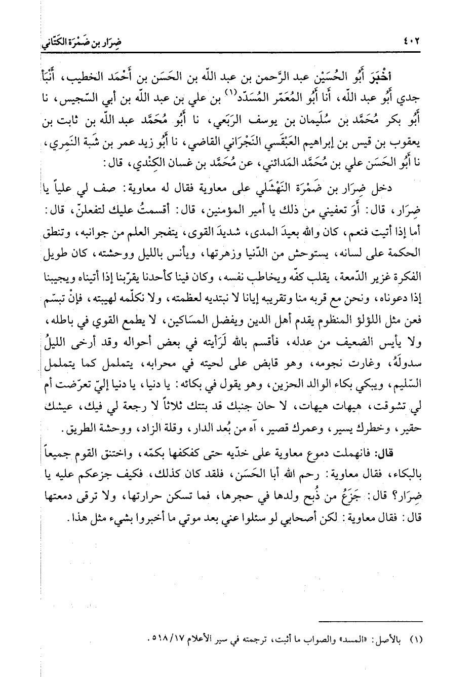 أخبر أبو الحسين عبد الرحمن بن عبد الله بن الحسن بن أحمد الخطيب أنبأ جدي أبو عبد الله أنا أبو المعمر المسدد (1) بن علي بن عبد الله بن أبي السجيس نا أبو بكر محمد بن سليمان بن يوسف الربعي نا أبو محمد عبد الله بن ثابت بن يعقوب بن قيس بن إبراهيم العبقسي النجراني القاضي نا أبو زيد عمر بن شبة النمري نا أبو الحسن علي بن محمد المدائني عن محمد بن غسان الكندي قال دخل ضرار بن ضمرة النهشلي على معاوية فقال له معاوية صف لي عليا يا ضرار قال أو تعفيني من ذلك يا أمير المؤمنين قال أقسمت عليك لتفعلن قال أما إذا أتيت فنعم كان والله بعيد المدى شديد القوى يتفجر العلم من جوانبه وتنطق الحكمة على لسانه يستوحش من الدنيا وزهرتها ويأنس بالليل ووحشته كان طويل الفكرة غزير الدمعة يقلب كفه ويخاطب نفسه وكان فينا كأحدنا يقربنا إذا أتيناه ويجيبنا إذا دعوناه ونحن مع قربه منا وتقريبه إيانا لا نبتديه لعظمته ولا نكلمه لهيبته فإن تبسم فعن مثل اللؤلؤ المنظوم يقدم أهل الدين ويفضل المساكين لا يطمع القوي في باطله ولا يأيس الضعيف من عدله فأقسم بالله لرأيته في بعض أحواله وقد أرخى الليل سدوله وغارت نجومه وهو قابض على لحيته في محرابه يتململ كما يتململ السليم ويبكي بكاء الوالد الحزين وهو يقول في بكائه يا دنيا يا دنيا إلي تعرضت أم لي تشوقت هيهات هيهات لا حان جنبك قد بتتك ثلاثا لا رجعة لي فيك عيشك حقير وخطرك يسير وعمرك قصير آه من يعد الدار وقلة الزاد ووحشة الطريق قال فانهملت دموع معاوية على خديه حتى كفكفها بكمه واختنق القوم جميعا بالبكاء فقال معاوية رحم الله أبا الحسن فلقد كان كذلك فكيف جزعكم عليه يا ضرار قال جزع من ذبح ولدها في حجرها فما تسكن حرارتها ولا ترقى دمعتها قال فقال معاوية لكن أصحابي لو سئلوا عني بعد موتي ما أخبروا بشئ مثل هذا