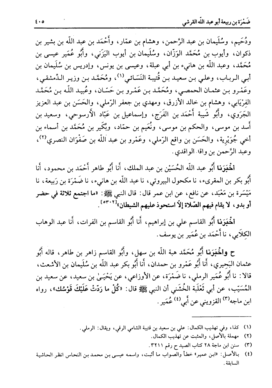 ودحيم وسليمان بن عبد الرحمن وهشام بن عمار وأحمد بن عبد الله بن بشير بن ذكوان وأيوب بن محمد الوزان وسليمان بن أيوب اليزني وأبو عمير عيسى بن محمد وعبد الله بن هانئ بن أبي عبلة وعيسى بن يونس وإدريس بن سليمان بن أبي الرباب وعلي بن سعيد بن قتيبة النسائي (1) ومحمد بن وزير الدمشقي وعمرو بن عثمان الحمصي ومحمد بن عمرو بن حسان وعبيد الله بن محمد الفريابي وهشام بن خالد الأزرق ومهدي بن جعفر الرملي والحسن بن عبد العزيز الجروي وأبو شيبة أحمد بن الفرج وإسماعيل بن عباد الأرسوحي وسعيد بن أسد بن موسى والحكم بن موسى ونعيم بن حماد وبكير بن محمد بن أسماء بن أخي جويرية والحسن بن واقع الرملي وعمرو بن عبد الله بن صفوان النصري (2) وعبد الرحمن بن واقد الواقدي أخبرنا أبو عبد الله الحسين بن عبد الملك أنا أبو طاهر أحمد بن محمود أنا أبو بكر بن المقرئ نا مكحول البيروتي نا عبد الله بن هانئ نا ضمرة بن ربيعة نا ميسرة بن معبد عن نافع عن ابن عمر قال قال النبي (صلى الله عليه وسلم) ما اجتمع ثلاثة في حضر أو بدو لا يقام فيهم الصلاة إلا استحوذ عليهم الشيطان أخبرنا أبو القاسم علي بن إبراهيم أنا أبو القاسم بن الفرات أنا عبد الوهاب الكلابي نا أحمد بن عمير بن يوسف ح وأخبرنا أبو محمد هبة الله بن سهل وأبو القاسم زاهر بن طاهر قاله أبو عثمان البحيري أنا أبو عمرو بن حمدان أنا أبو بكر عبد الله بن سليمان بن الأشعث قالا نا أبو عمير الرملي نا ضمرة عن الأوزاعي عن يحيى بن سعيد عن سعيد بن المسيب عن أبي ثعلبة الخشني أن النبي (صلى الله عليه وسلم) قال كل ما ردت عليك قوسك رواه ابن ماجه (3) القزويني عن أبي (4) عمير