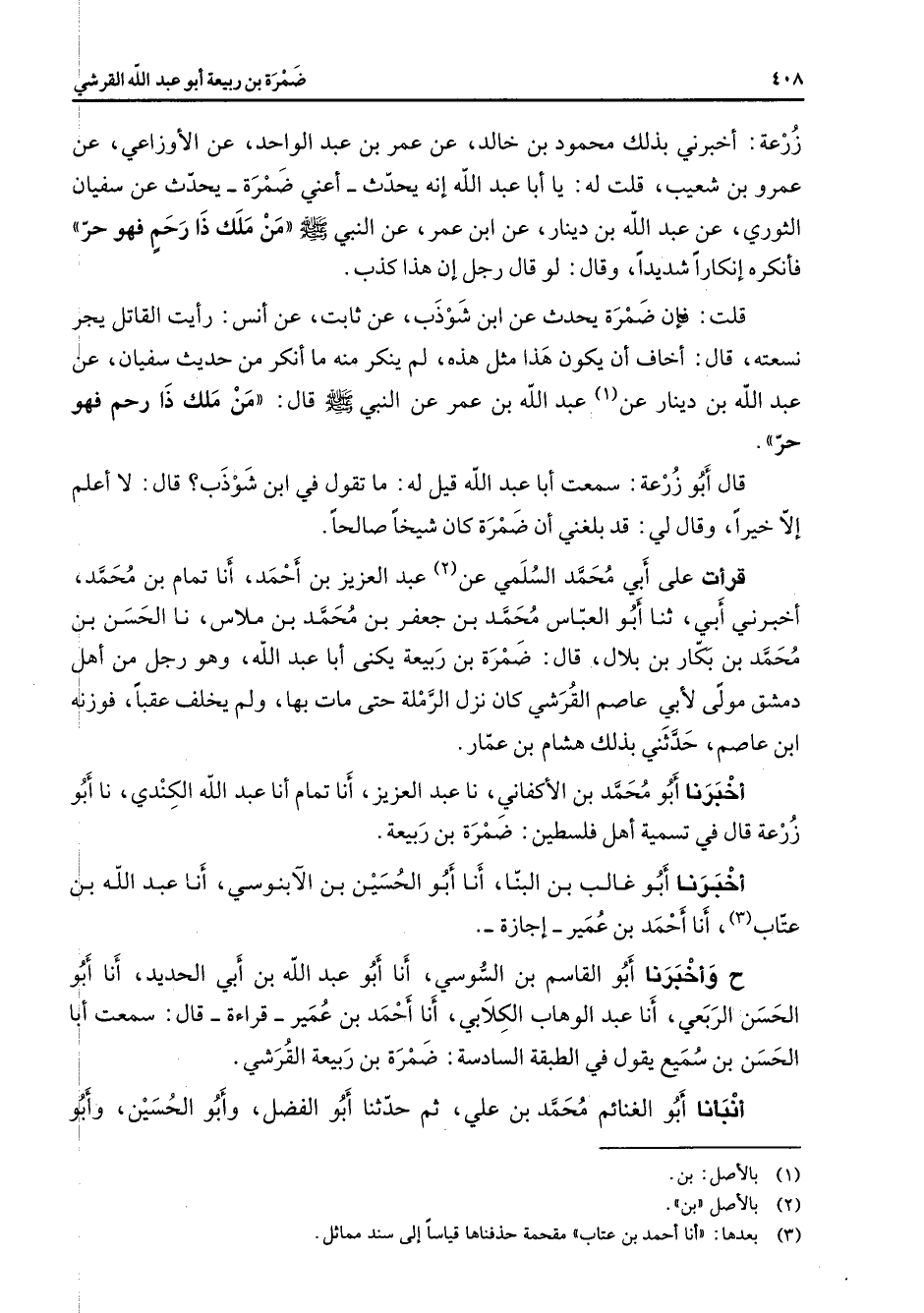 زرعة أخبرني بذلك محمود بن خالد عن عمر بن عبد الواحد عن الأوزاعي عن عمرو بن شعيب قلت له يا أبا عبد الله إنه يحدث أعني ضمرة يحدث عن سفيان الثوري عن عبد الله بن دينار عن ابن عمر عن النبي (صلى الله عليه وسلم) من ملك ذا رحم فهو حر فأنكره إنكارا شديدا وقال لو قال رجل إن هذا كذب قلت فإن ضمرة يحدث عن ابن شؤذب عن ثابت عن أنس رأيت القاتل يجر نسعته قال أخاف أن يكون هذا مثل هذه لم ينكر منه ما أنكر من حديث سفيان عن عبد الله بن دينار عن (1) عبد الله بن عمر عن النبي (صلى الله عليه وسلم) قال من ملك ذا رحم فهو حر قال أبو زرعة سمعت أبا عبد الله قيل له ما تقول في ابن شؤذب قال لا أعلم إلا خيرا وقال لي قد بلغني أن ضمرة كان شيخا صالحا قرأت على أبي محمد السلمي عن (2) عبد العزيز بن أحمد أنا تمام بن محمد أخبرني أبي ثنا أبو العباس محمد بن جعفر بن محمد بن ملاس نا الحسن بن محمد بن بكار بن بلال قال ضمرة بن ربيعة يكنى أبا عبد الله وهو رجل من أهل دمشق مولى لأبي عاصم القرشي كان نزل الرملة حتى مات بها ولم يخلف عقبا فوزنه ابن عاصم حدثني بذلك هشام بن عمار أخبرنا أبو محمد بن الأكفاني نا عبد العزيز أنا تمام أنا عبد الله الكندي نا أبو زرعة قال في تسمية أهل فلسطين ضمرة بن ربيعة أخبرنا أبو غالب بن البنا أنا أبو الحسين بن الآبنوسي أنا عبد الله بن عتاب (3) أنا أحمد بن عمير إجازة ح وأخبرنا أبو القاسم بن السوسي أنا أبو عبد الله بن أبي الحديد أنا أبو الحسن الربعي أنا عبد الوهاب الكلابي أنا أحمد بن عمير قراءة قال سمعت أبا الحسن بن سميع يقول في الطبقة السادسة ضمرة بن ربيعة القرشي أنبأنا أبو الغنائم محمد بن علي ثم حدثنا أبو الفضل وأبو الحسين وأبو