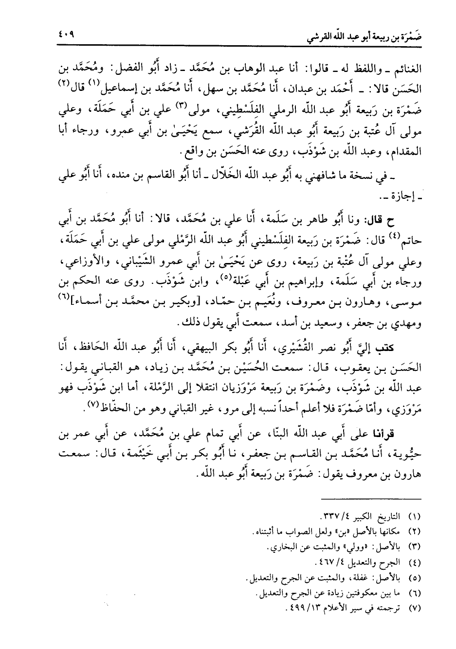 الغنائم واللفظ له قالوا أنا عبد الوهاب بن محمد زاد أبو الفضل ومحمد بن الحسن قالا أحمد بن عبدان أنا محمد بن سهل أنا محمد بن إسماعيل (1) قال (2) ضمرة بن ربيعة أبو عبد الله الرملي الفلسطيني مولى (3) علي بن أبي حملة وعلى مولى آل عتبة بن ربيعة أبو عبد الله القرشي سمع يحيى بن أبي عمرو ورجاء أبا المقدام وعبد الله بن شؤذب روى عنه الحسن بن واقع في نسخة ما شافهني به أبو عبد الله الخلال أنا أبو القاسم بن منده أنا أبو علي وإجازة ح قال ونا أبو طاهر بن سلمة أنا علي بن محمد قالا أنا أبو محمد بن أبي حاتم (4) قال ضمرة بن ربيعة الفلسطيني أبو عبد الله الرملي مولى علي بن أبي حملة وعلي مولى آل عتبة بن ربيعة روى عن يحيى بن أبي عمرو الشيباني والأوزاعي ورجاء بن أبي سلمة وإبراهيم بن أبي عبلة (5) وابن شؤذب روى عنه الحكم بن موسى وهارون بن معروف ونعيم بن حماد وبكير بن محمد بن أسماء (6) ومهدي بن جعفر وسعيد بن أسد سمعت أبي يقول ذلك كتب إلي أبو نصر القشيري أنا أبو بكر البيهقي أنا أبو عبد الله الحافظ أنا الحسن بن يعقوب قال سمعت الحسين بن محمد بن زياد هو القباني يقول عبد الله بن شؤذب وضمرة بن ربيعة مروزيان انتقلا إلى الرملة أما ابن شؤذب فهو مروزي وأما ضمرة فلا أعلم أحدا نسبه إلى مرو غير القباني وهو من الحفاظ (7)