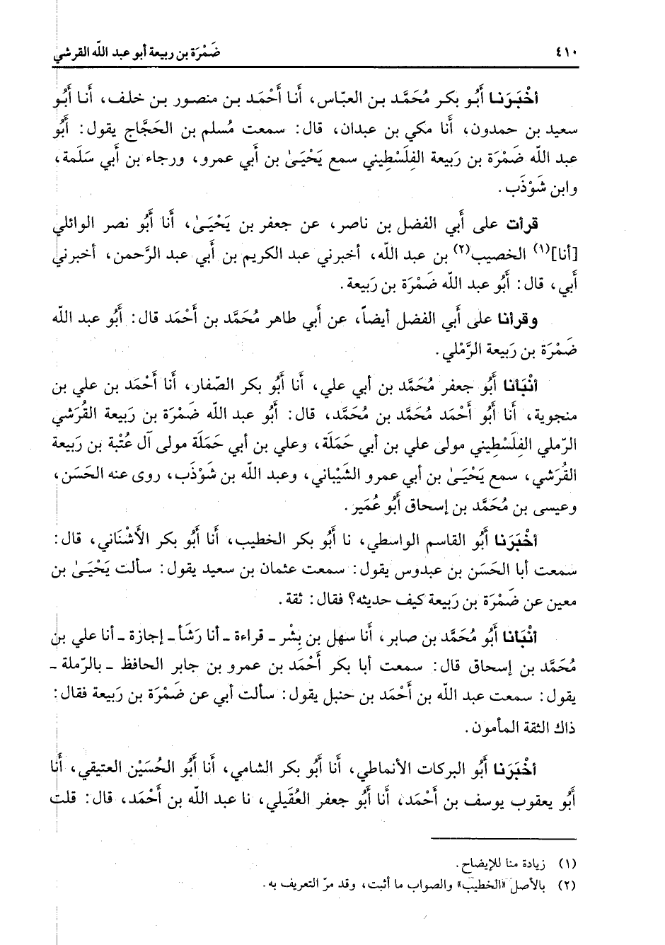 أخبرنا أبو بكر محمد بن العباس أنا أحمد بن منصور بن خلف أنا أبو سعيد بن حمدون أنا مكي بن عبدان قال سمعت مسلم بن الحجاج يقول أبو عبد الله ضمرة بن ربيعة الفلسطيني سمع يحيى بن أبي عمرو ورجاء بن أبي سلمة وابن شوذب قرأت على أبي الفضل بن ناصر عن جعفر بن يحيى أنا أبو نصر الوائلي أنا (1) الخصيب (2) بن عبد الله أخبرني عبد الكريم بن أبي عبد الرحمن أخبرني أبي قال أبو عبد الله ضمرة بن ربيعة وقرأنا على أبي الفضل أيضا عن أبي طاهر محمد بن أحمد قال أبو عبد الله ضمرة بن ربيعة الرملي أنبأنا أبو جعفر محمد بن أبي علي أنا أبو بكر الصفار أنا أحمد بن علي بن منجوية أنا أبو أحمد محمد بن محمد قال أبو عبد الله ضمرة بن ربيعة القرشي الرملي الفلسطيني مولى علي بن أبي حملة وعلي بن أبي حملة مولى آل عتبة بن ربيعة القرشي سمع يحيى بن أبي عمرو الشيباني وعبد الله بن شوذب روى عنه الحسن وعيسى بن محمد بن إسحاق أبو عمير أخبرنا أبو القاسم الواسطي نا أبو بكر الخطيب أنا أبو بكر الأشناني قال سمعت أبا الحسن بن عبدوس يقول سمعت عثمان بن سعيد يقول سألت يحيى بن معين عن ضمرة بن ربيعة كيف حديثه فقال ثقة أنبأنا أبو محمد بن صابر أنا سهل بن بشر قراءة أنا رشأ إجازة أنا علي بن محمد بن إسحاق قال سمعت أبا بكر أحمد بن عمرو بن جابر الحافظ بالرملة يقول سمعت عبد الله بن أحمد بن حنبل يقول سألت أبي عن ضمرة بن ربيعة فقال ذاك الثقة المأمون أخبرنا أبو البركات الأنماطي أنا أبو بكر الشامي أنا أبو الحسين العتيقي أنا أبو يعقوب يوسف بن أحمد أنا أبو جعفر العقيلي نا عبد الله بن أحمد قال قلت