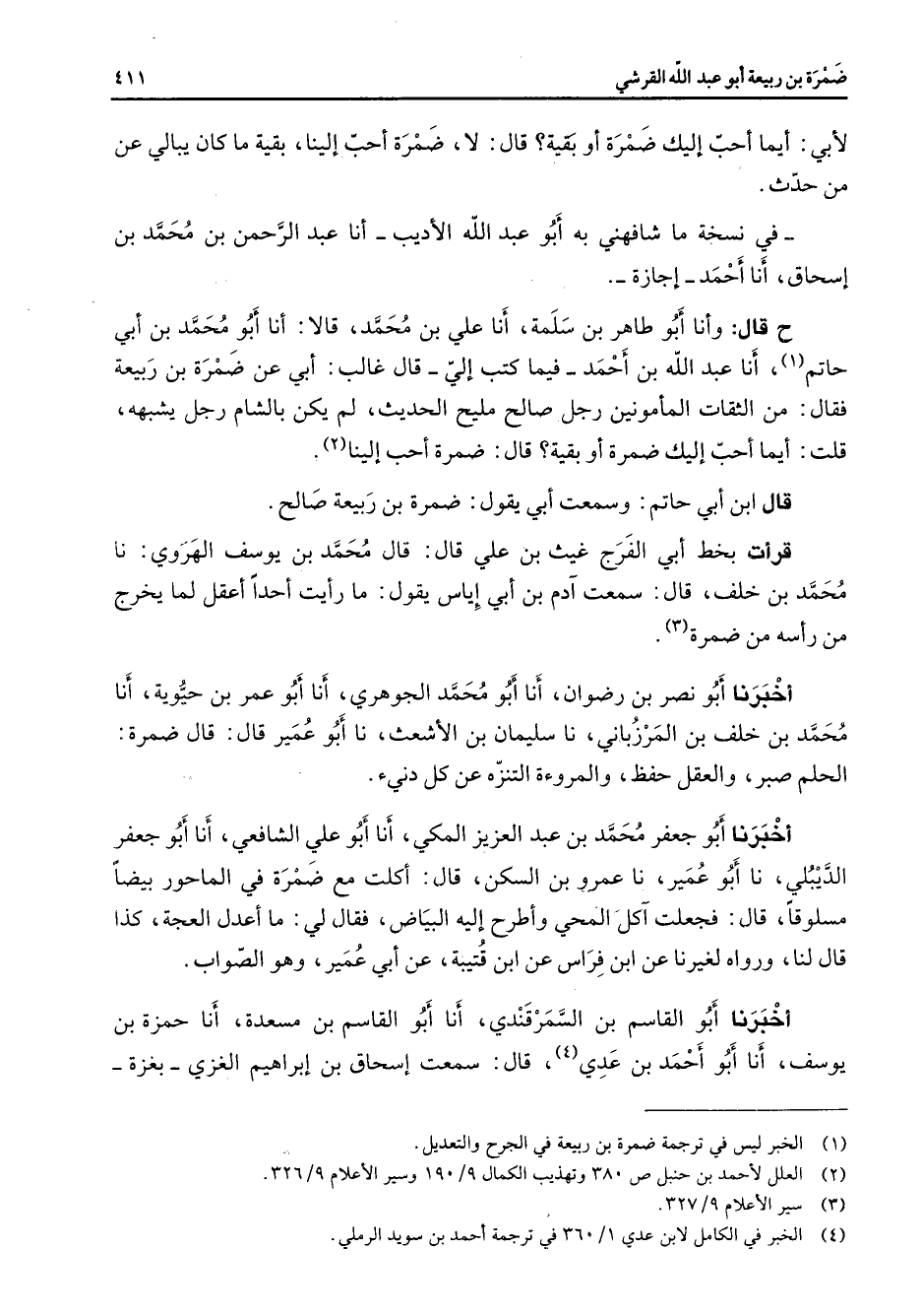 لأبي أيما أحب إليك ضمرة أبو بقية قال لا ضمرة أحب إلينا بقية ما كان يبالي عن من حدث في نسخة ما شافهني به أبو عبد الله الأديب أنا عبد الرحمن بن محمد بن إسحاق أنا أحمد إجازة ح قال وأنا أبو طاهر بن سلمة أنا علي بن محمد قالا أنا أبو محمد بن أبي حاتم (1) أنا عبد الله بن أحمد فيما كتب إلي قال غالب أبي عن ضمرة بن ربيعة فقال من الثقات المأمونين رجل صالح مليح الحديث لم يكن بالشام رجل يشبهه قلت أيما أحب إليك ضمرة أو بقية قال ضمرة أحب إلينا (2)