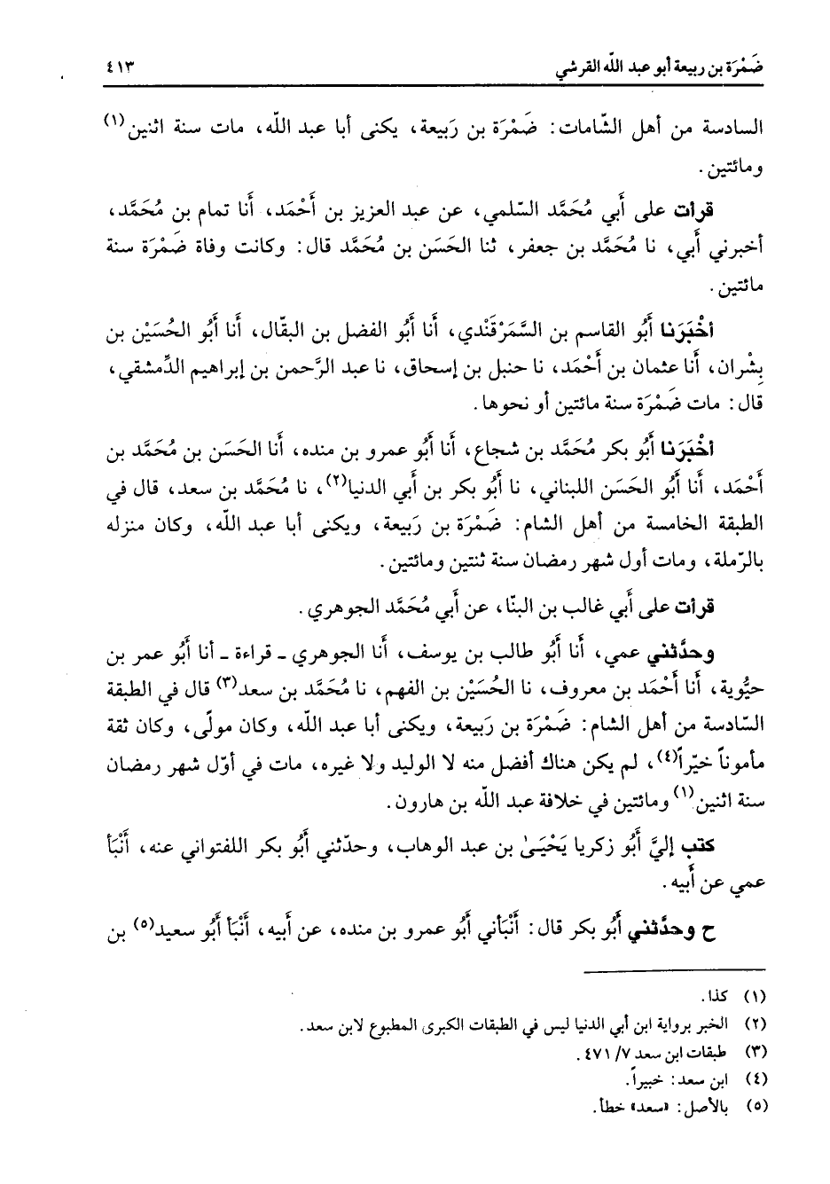 السادسة من أهل الشامات ضمرة بن ربيعة يكنى أبا عبد الله مات سنة اثنين (1) ومائتين قرأت على أبي محمد السلمي عن عبد العزيز بن أحمد أنا تمام بن محمد أخبرني أبي نا محمد بن جعفر ثنا الحسن بن محمد قال وكانت وفاة ضمرة سنة مائتين أخبرنا أبو القاسم بن السمرقندي أنا أبو الفضل بن البقال أنا أبو الحسين بن بشران أنا عثمان بن أحمد نا حنبل بن إسحاق نا عبد الرحمن بن إبراهيم الدمشقي قال مات ضمرة سنة مائتين أو نحوها أخبرنا أبو بكر محمد بن شجاع أنا أبو عمرو بن منده أنا الحسن بن محمد بن أحمد أنا أبو الحسن اللبناني نا أبو بكر بن أبي الدنيا (2) نا محمد بن سعد قال في الطبقة الخامسة من أهل الشام ضمرة بن ربيعة ويكنى أبا عبد الله وكان منزله بالرملة ومات أول شهر رمضان سنة ثنتين ومائتين قرأت على أبي غالب بن البنا عن أبي محمد الجوهري وحدثني عمي أنا أبو طالب بن يوسف أنا الجوهري قراءة أنا أبو عمر بن حيوية أنا أحمد بن معروف نا الحسين بن الفهم نا محمد بن سعد (3) قال في الطبقة السادسة من أهل الشام ضمرة بن ربيعة ويكنى أبا عبد الله وكان مولى وكان ثقة مأمونا خيرا (4) لم يكن هناك أفضل منه لا الوليد ولا غيره مات في أول شهر رمضان سنة اثنتين (1) ومائتين في خلافة عبد الله بن هارون كتب إلي أبو زكريا يحيى بن عبد الوهاب وحدثني أبو بكر اللفتواني عنه أنبأ عمي عن أبيه ح وحدثني أبو بكر قال أنبأني أبو عمرو بن منده عن أبيه أنبأ أبو سعيد (5) بن
