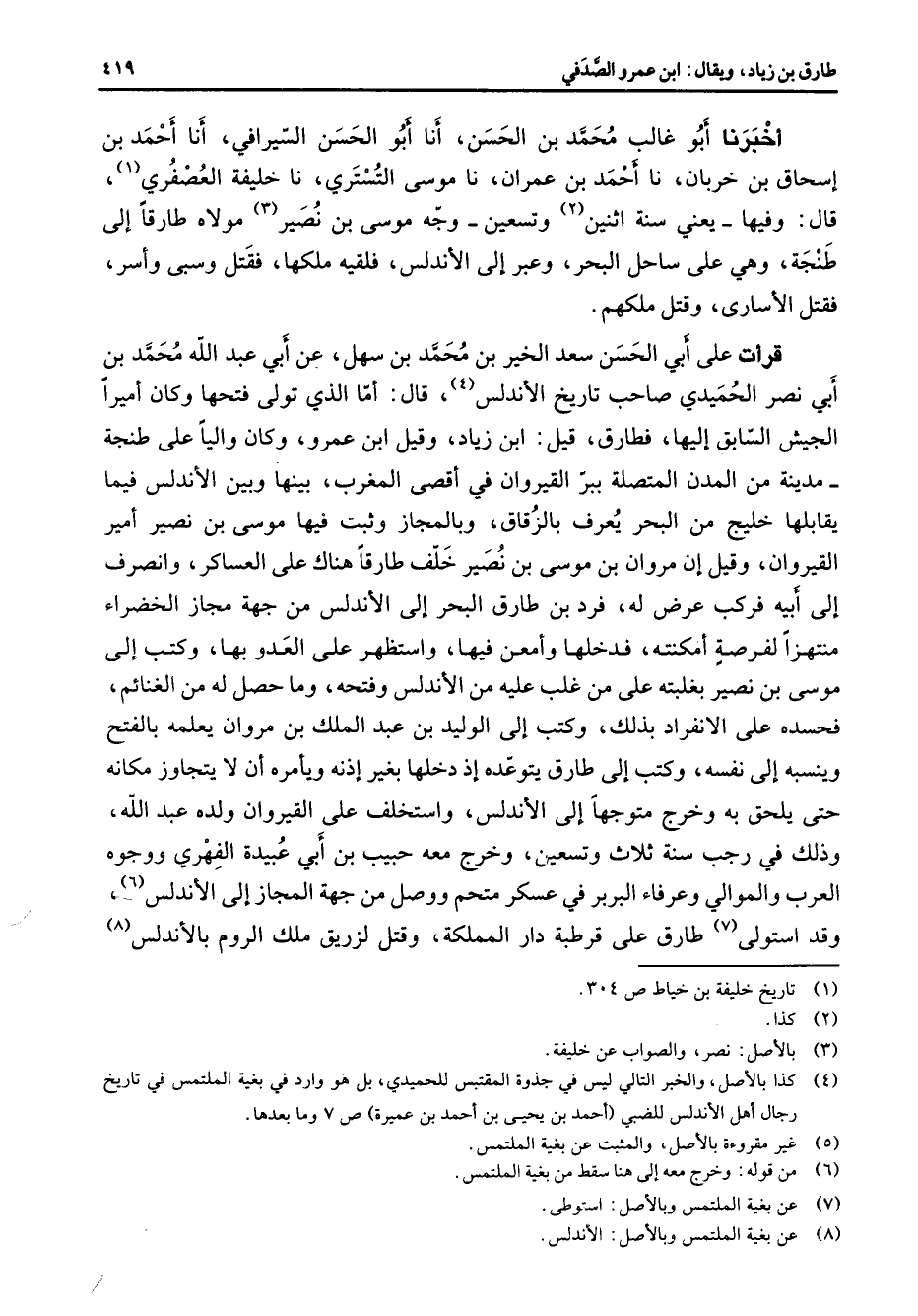 أخبرنا أبو غالب محمد بن الحسن أنا أبو الحسن السيرافي أنا أحمد بن إسحاق بن خربان نا أحمد بن عمران نا موسى التستري نا خليفة العصفري (1) قال وفيها يعني سنة اثنين (2) وتسعين وجه موسى بن نصير (3) مولاه طارقا إلى طنجة وهي على ساحل البحر وعبر إلى الأندلس فلقيه ملكها فقتل وسبى وأسر فقتل الأساري وقتل ملكهم قرأت على أبي الحسن سعد الخير بن محمد بن سهل عن أبي عبد الله محمد بن أبي نصر الحميدي صاحب تاريخ الأندلس (4) قال أما الذي تولى فتحها وكان أميرا الجيش السابق إليها فطارق قيل ابن زياد وقيل ابن عمرو وكان واليا على طنجة مدينة من المدن المتصلة ببر القيروان في أقصى المغرب بينها وبين الأندلس فيما يقابلها خليج من البحر يعرف بالزقاق وبالمجاز وثبت فيها موسى بن نصير أمير القيروان وقيل إن مروان بن موسى بن نصير خلف طارقا هناك على العساكر وانصرف إلى أبيه فركب عرض له فرد بن طارق البحر إلى الأندلس من جهة مجاز الخضراء منتهزا لفرصة أمكنته فدخلها وأمعن فيها واستظهر على العدو بها وكتب إلى موسى بن نصير بغلبته على من غلب عليه من الأندلس وفتحه وما حصل له من الغنائم فحسده على الانفراد بذلك وكتب إلى الوليد بن عبد الملك بن مروان يعلمه بالفتح وينسبه إلى نفسه وكتب إلى طارق يتوعده إذ دخلها بغير إذنه ويأمره أن لا يتجاوز مكانه حتى يلحق به وخرج متوجها إلى الأندلس واستخلف على القيروان ولده عبد الله وذلك في رجب سنة ثلاث وتسعين وخرج معه حبيب بن أبي عبيدة الفهري ووجوه العرب والموالي وعرفاء البربر في عسكر متحم ووصل من جهة المجاز إلى الأندلس (6) وقد استولى (7) طارق على قرطبة دار المملكة قتل لزريق ملك الروم بالأندلس (8)