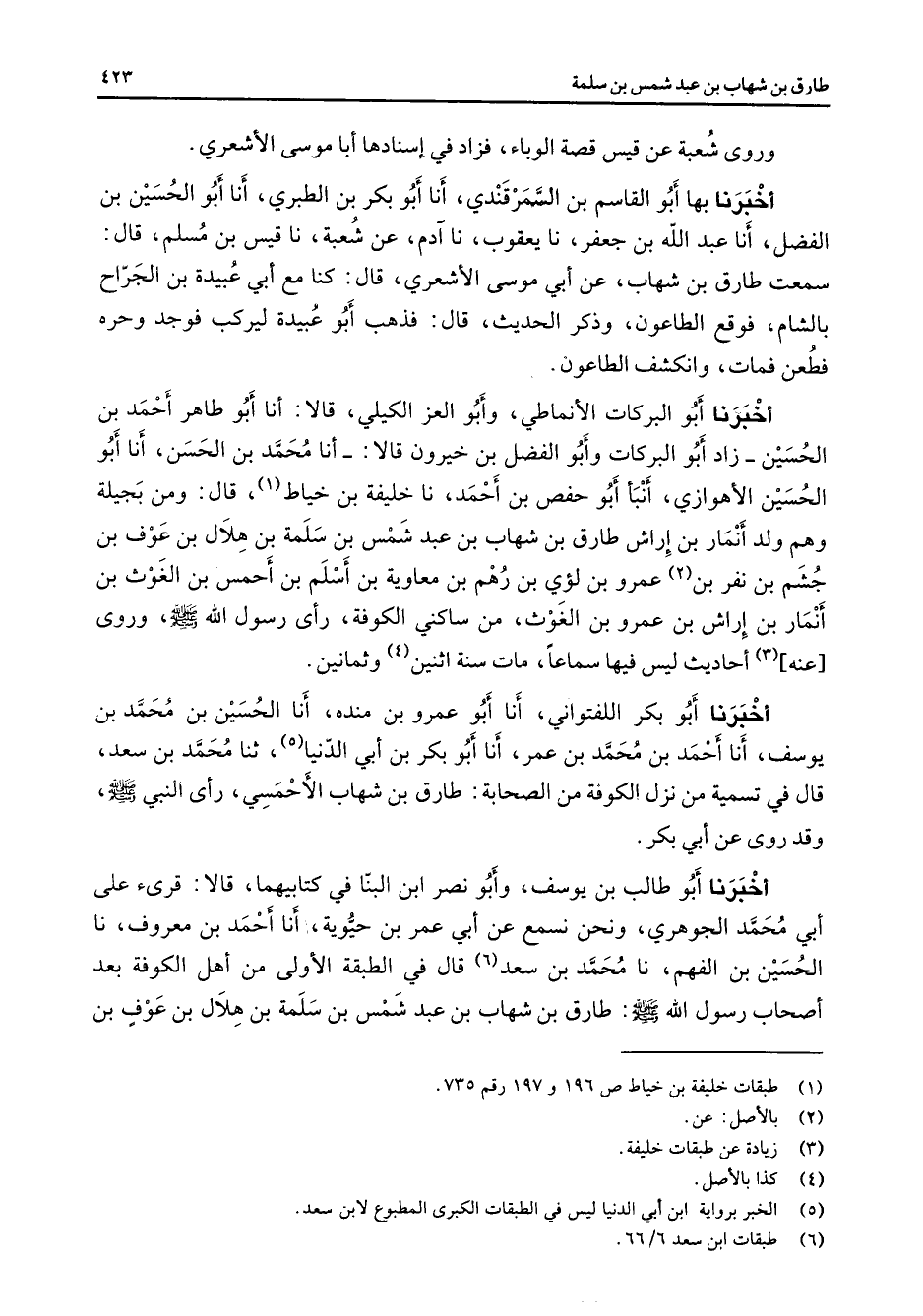 وروى شعبة عن قيس قصة الوباء فزاد في إسنادها أبا موسى الأشعري أخبرنا بها أبو القاسم بن السمرقندي أنا أبو بكر بن الطبري أنا أبو الحسين بن الفضل أنا عبد الله بن جعفر نا يعقوب نا آدم عن شعبة نا قيس بن مسلم قال سمعت طارق بن شهاب عن أبي موسى الأشعري قال كنا مع أبي عبيدة بن الجراح بالشام فوقع الطاعون وذكر الحديث قال فذهب أبو عبيدة ليركب فوجد وحره فطعن فمات وانكشف الطاعون أخبرنا أبو البركات الأنماطي وأبو العز الكيلي قالا أنا أبو طاهر أحمد بن الحسين زاد أبو البركات وأبو الفضل بن خيرون قالا أنا محمد بن الحسن أنا أبو الحسين الأهوازي أنبأ أبو حفص بن أحمد نا خليفة بن خياط (1) قال ومن نجيلة وهم ولد أنمار بن إراش طارق بن شهاب بن عبد شمس بن سلمة بن هلال بن عوف بن جشم بن نفر بن (2) عمرو بن لؤي بن رهم بن معاوية بن أسلم بن أحمس بن الغوث بن أنمار بن إراش بن عمرو بن الغوث من ساكني الكوفة رأى رسول الله (صلى الله عليه وسلم) وروى عنه (3) أحاديث ليس فيها سماعا مات سنة اثنين (4) وثمانين أخبرنا أبو بكر اللفتواني أنا أبو عمرو بن منده أنا الحسين بن محمد بن يوسف أنا أحمد بن محمد بن عمر أنا أبو بكر بن أبي الدنيا (5) ثنا محمد بن سعد قال في تسمية من نزل الكوفة من الصحابة طارق بن شهاب الأحمسي رأى النبي (صلى الله عليه وسلم) وقد روى عن أبي بكر أخبرنا أبو طالب بن يوسف وأبو نصر ابن البنا في كتابيهما قالا قرئ على أبي محمد الجوهري ونحن نسمع عن أبي عمر بن حيوية أنا أحمد بن معروف نا الحسين بن الفهم نا محمد بن سعد (6) قال في الطبقة الأولى من أهل الكوفة بعد أصحاب رسول الله (صلى الله عليه وسلم) طارق بن شهاب بن عبد شمس بن سلمة بن هلال بن عوف بن