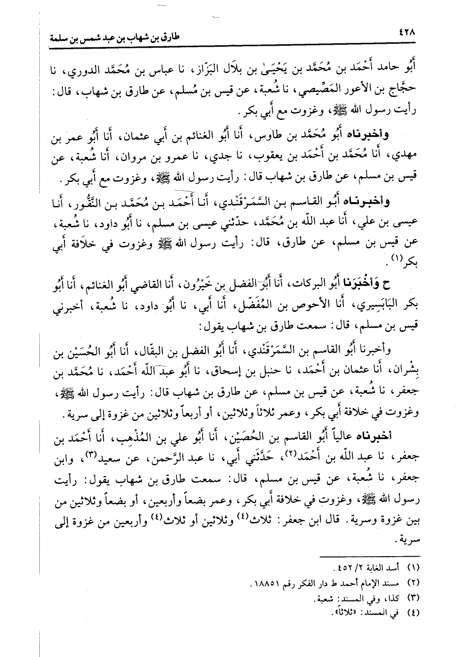 أبو حامد أحمد بن محمد بن يحيى بن بلال البزاز نا عباس بن محمد الدوري نا حجاج بن الأعور المصيصي نا شعبة عن قيس بن مسلم عن طارق بن شهاب قال رأيت رسول الله (صلى الله عليه وسلم) وغزوت مع أبي بكر وأخبرناه أبو محمد بن طاوس أنا أبو الغنائم بن أبي عثمان أنا أبو عمر بن مهدي أنا محمد بن أحمد بن يعقوب نا جدي نا عمرو بن مروان أنا شعبة عن قيس بن مسلم عن طارق بن شهاب قال رأيت رسول الله (صلى الله عليه وسلم) وغزوت مع أبي بكر وأخبرناه أبو القاسم بن السمرقندي أنا أحمد بن محمد بن النقور أنا عيسى بن علي أنا عبد الله بن محمد حدثني عيسى بن مسلم نا أبو داود نا شعبة عن قيس بن مسلم عن طارق قال رأيت رسول الله (صلى الله عليه وسلم) وغزوت في خلافة أبي بكر (1)