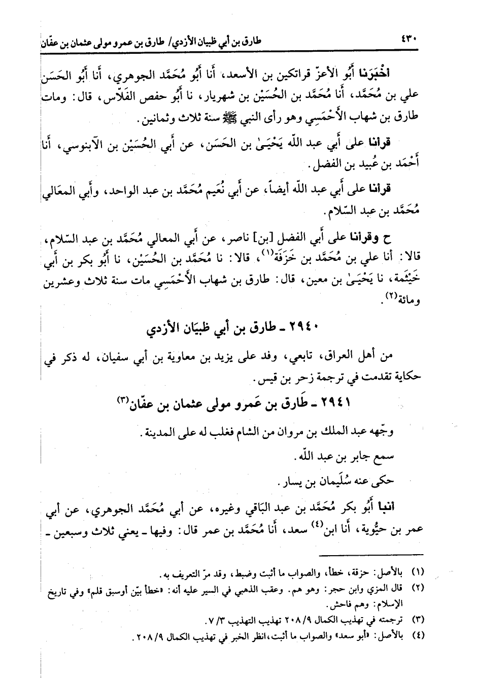 أخبرنا أبو الأعز قراتكين بن الأسعد أنا أبو محمد الجوهري أنا أبو الحسن علي بن محمد أنا محمد بن الحسين بن شهريار نا أبو حفص الفلاس قال ومات طارق بن شهاب الأحمسي وهو رأى النبي (صلى الله عليه وسلم) سنة ثلاث وثمانين قرأنا على أبي عبد الله يحيى بن الحسن عن أبي الحسين بن الآبنوسي أنا أحمد بن عبيد بن الفضل قرأنا على أبي عبد الله أيضا عن أبي نعيم محمد بن عبد الواحد وأبي المعالي محمد بن عبد السلام ح وقرأنا على أبي الفضل بن ناصر عن أبي المعالي محمد بن عبد السلام قالا أنا علي بن محمد بن خزفة (1) قالا نا محمد بن الحسين نا أبو بكر بن أبي خيثمة نا يحيى بن معين قال طارق بن شهاب الأحمسي مات سنة ثلاث وعشرين ومائة (2)
