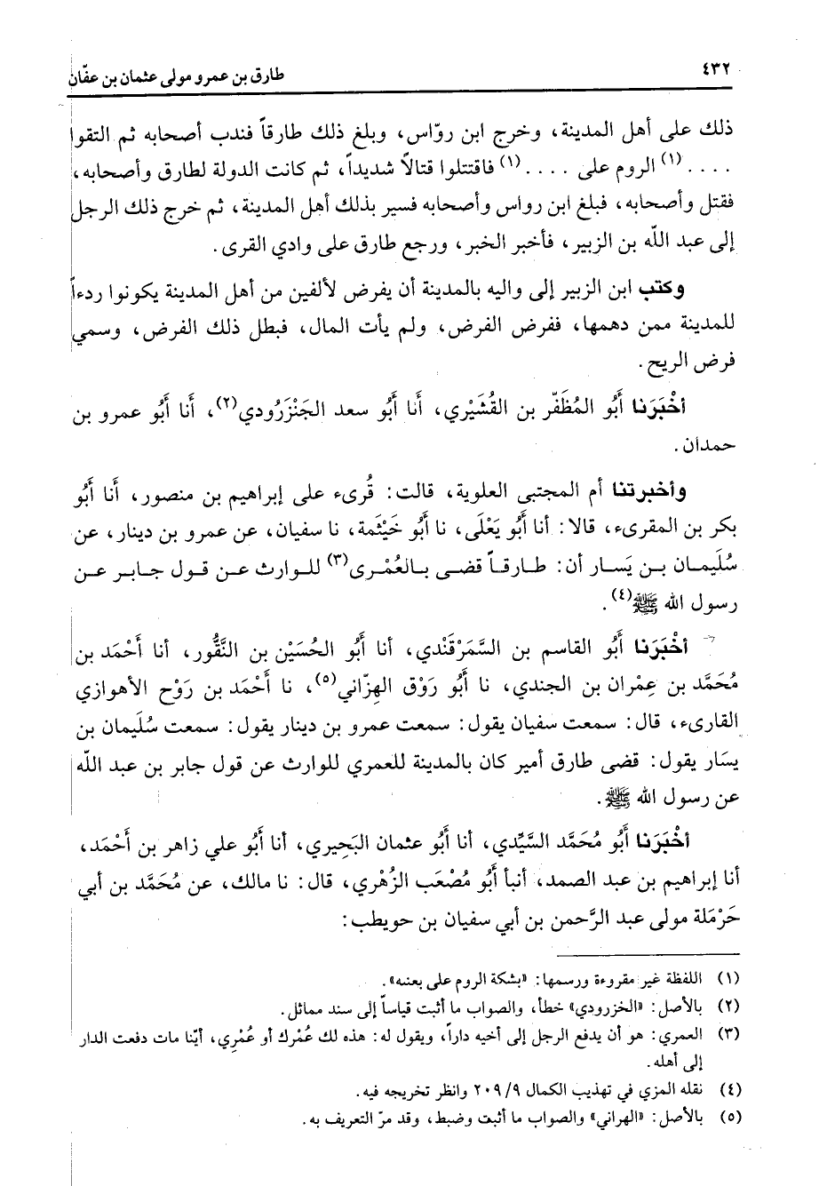 أخبرنا أبو القاسم بن السمرقندي أنا أبو الحسين بن النقور أنا أحمد بن محمد بن عمران بن الجندي نا أبو روق الهزاني (5) نا أحمد بن روح الأهوازي القارئ قال سمعت سفيان يقول سمعت عمرو بن دينار يقول سمعت سليمان بن يسار يقول قضى طارق أمير كان بالمدينة للعمري للوارث عن قول جابر بن عبد الله عن رسول الله (صلى الله عليه وسلم) أخبرنا أبو محمد السيدي أنا أبو عثمان البحيري أنا أبو علي زاهر بن أحمد أنا إبراهيم بن عبد الصمد أنبأ أبو مصعب الزهري قال نا مالك عن محمد بن أبي حرملة مولى عبد الرحمن بن أبي سفيان بن حويطب