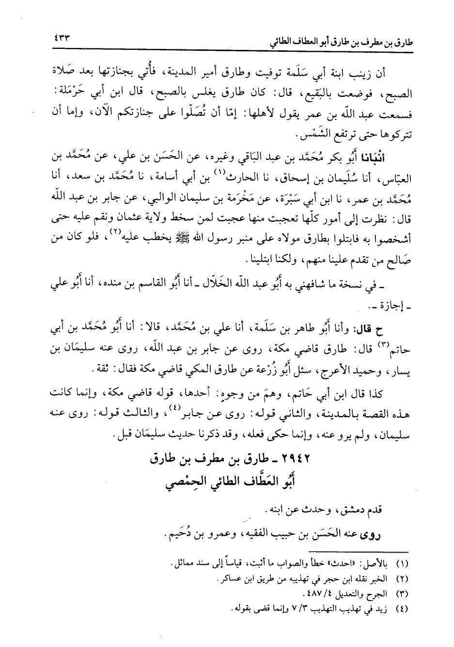 2942 - طارق بن مطرف بن طارق أبو العطاف الطائي الحمصي قدم دمشق وحدث عن ابنه روى عنه الحسن بن حبيب الفقيه وعمرو بن دحيم