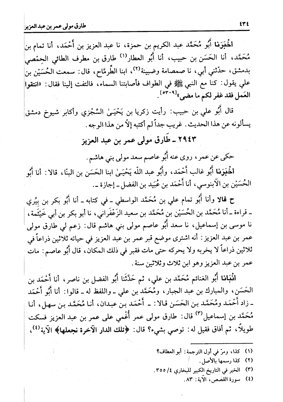 2943 - طارق مولى عمر بن عبد العزيز حكى عن عمر روى عنه أبو عاصم سعد مولى بني هاشم أخبرنا أبو غالب أحمد وأبو عبد الله يحيى ابنا الحسن بن البنا قالا أنا أبو الحسين بن الآبنوسي أنا أحمد بن عبيد بن الفضل إجازة ح قالا وأنا أبو تمام علي بن محمد الواسطي في كتابه أنا أبو بكر بن بيري قراءة أنا محمد بن الحسين بن محمد بن سعيد الزعفراني نا أبو بكر بن أبي خيثمة نا موسى بن إسماعيل نا سعد أبو عاصم مولى بني هاشم قال زعم لي طارق مولى عمر بن عبد العزيز انه اشترى موضع قبر عمر بن عبد العزيز في حياته ثلاثين ذراعا في ثلاثين ذراعا لا يخربه ولا يحركه حتى مات فقير في ذلك المكان قال أبو عاصم مات عمر بن عبد العزيز وهو ابن ثلاث وثلاثين سنة أنبأنا أبو الغنائم محمد بن علي ثم حدثنا أبو الفضل بن ناصر أنا أحمد بن الحسن والمبارك بن عبد الجبار ومحمد بن علي واللفظ له قالوا أنا أبو أحمد زاد أحمد ومحمد بن الحسن قالا أحمد بن عبدان أنا محمد بن سهل أنا محمد بن إسماعيل (3) قال طارق مولى عمر أغمي على عمر بن عبد العزيز فسكت طويلا ثم أفاق فقيل له توصي بشئ قال " تلك الدار الآخرة نجعلها " الآية (4)