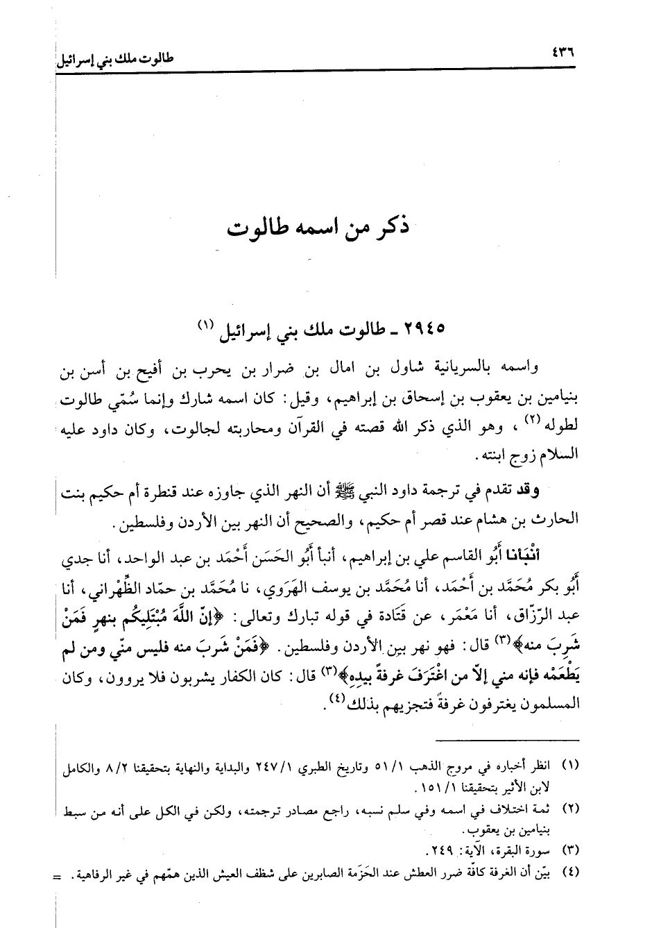 2945 - طالوت ملك بني إسرائيل (1) واسمه بالسريانية شاول بن امال بن ضرار بن يحرب بن أفيح بن أسن بن بنيامين بن يعقوب بن إسحاق بن إبراهيم وقيل كان اسمه شارك وإنما سمي طالوت لطوله (2) وهو الذي ذكر الله 4 قصته في القرآن ومحاربته لجالوت وكان داود عليه السلام زوج ابنته وقد تقدم في ترجمة داود النبي (صلى الله عليه وسلم) أن النهر الذي جاوزه عند قنطرة أم حكيم بنت الحارث بن هشام عند قصر أم حكيم والصحيح أن النهر بين الأردن وفلسطين أنبأنا أبو القاسم علي بن إبراهيم أنبأ أبو الحسن أحمد بن عبد الواحد أنا جدي أبو بكر محمد بن أحمد أنا محمد بن يوسف الهروي نا محمد بن حماد الظهراني أنا عبد الرزاق أنا معمر عن قتادة في قوله تبارك وتعالى " إن الله مبتليكم بنهر فمن شرب منه " (3) قال فهو نهر بين الأردن وفلسطين " فمن شرب منه فليس مني ومن لم يطعمه فإنه مني إلا من اغترف غرفة بيده " (3) قال كان الكفار يشربون فلا يروون وكان المسلمون يغترفون غرفة فتجزيهم بذلك (4)