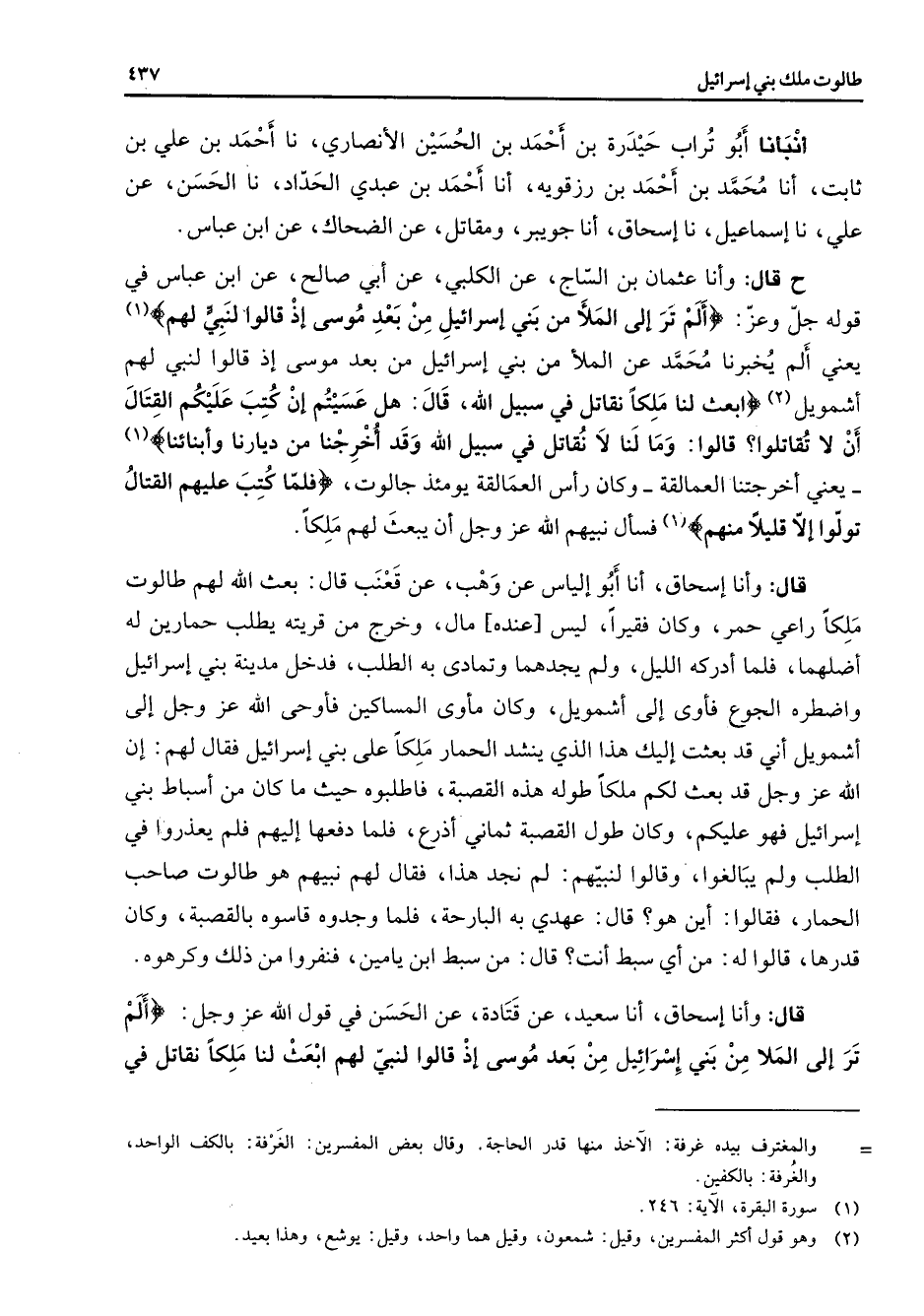 أنبأنا أبو تراب حيدرة بن أحمد بن الحسين الأنصاري نا أحمد بن علي بن ثابت أنا محمد بن أحمد بن رزقويه أنا أحمد بن عبدي الحداد نا الحسن عن علي نا إسماعيل نا إسحاق أنا جويبر ومقاتل عن الضحاك عن ابن عباس ح قال وأنا عثمان بن الساج عن الكلبي عن أبي صالح عن ابن عباس في قوله جل وعز " ألم تر إلى الملأ من بني إسرائيل من بعد موسى إذ قالوا لنبي لهم " (1) يعني ألم يخبرنا محمد عن الملأ من بني إسرائيل من بعد موسى إذ قالوا لنبي لهم أشمويل " (2) ابعث لنا ملكا نقاتل في سبيل الله قال هل عسيتم إن كتب عليكم القتال أن لا تقاتلوا قالوا وما لنا لا نقاتل في سبيل الله وقد أخرجنا من ديارنا وأبنائنا " (1) يعني أخرجتنا العمالقة كان رأس العمالقة يومئذ جالوت " فلما كتب عليهم القتال تولوا إلا قليلا منهم " (1) فسأل نبيهم الله عز وجل أن يبعث لهم ملكا قال وأنا إسحاق أنا أبو إلياس عن وهب عن قعنب قال بعث الله لهم طالوت ملكا راعي حمر وكان فقيرا ليس عنده مال وخرج من قريته يطلب حمارين له أضلهما فلما أدركه الليل ولم يجدهما وتمادى به الطلب فدخل مدينة بني إسرائيل واضطره الجوع فأوى إلى أشمويل وكان مأوى المساكين فأوحى الله عز وجل إلى أشمويل أني قد بعثت إليك هذا الذي ينشد الحمار ملكا على بني إسرائيل فقال لهم إن الله عز وجل قد بعث لكن ملكا طوله هذه القصبة فاطلبوه حيث ما كان من أسباط بني إسرائيل فهو عليكم وكان طول القصبة ثماني أذرع فلما دفعها إليهم فلم يعذروا في الطلب ولم يبالغوا وقالوا لنبيهم لم نجد هذا فقال لهم نبيهم هو طالوت صاحب الحمار فقالوا أين هو قال عهدي به البارحة فلما وجدوه قاسوه بالقصبة وكان قدرها قالوا له من أي سبط أنت قال من سبط ابن يامين فنفروا من ذلك وكرهوه قال وأنا إسحاق أنا سعيد عن قتادة عن الحسن في قول الله عز وجل " ألم تر إلى الملأ من بني إسرائيل من بعد موسى إذ قالوا لنبي لهم ابعث لنا ملكا نقاتل في "