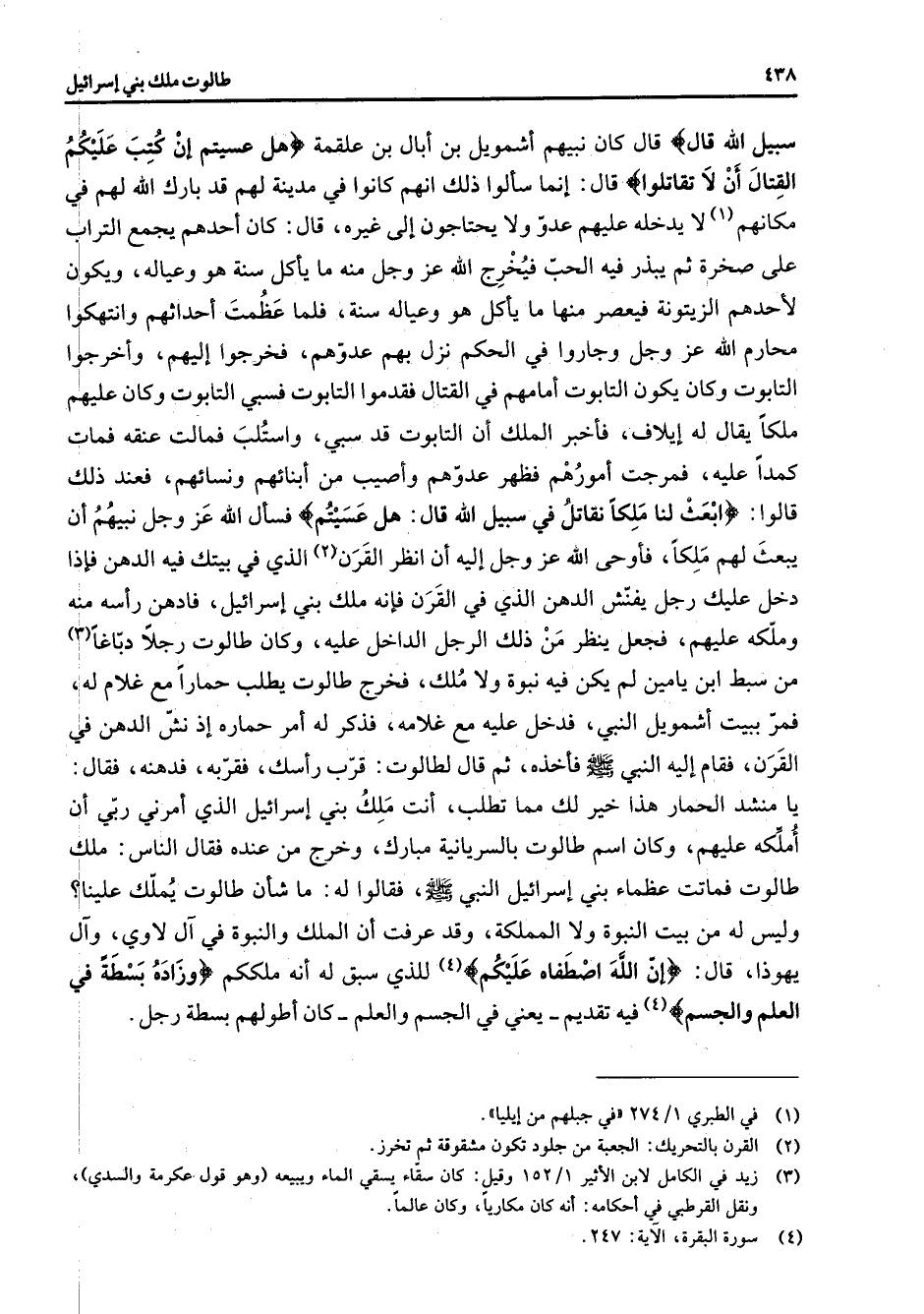 " سبيل الله قال " قال كان نبيهم أشمويل بن أبال بن علقمة " هل عسيتم إن كتب عليكم القتال أن لا تقاتلوا " قال إنما سألوا ذلك أنهم كانوا في مدينة لهم قد بارك الله لهم في مكانهم (1) لا يدخله عليهم عدو ولا يحتاجون إلى غيره قال كان أحدهم يجمع التراب على صخرة ثم يبذر فيه الحب فيخرج الله عز وجل منه ما يأكل سنة هو وعياله ويكون لأحدهم الزيتونه فيعصر منها ما يأكل هو وعياله سنة فلما عظمت أحداثهم وانتكهوا محارم الله عز وجل وجاروا في الحكم نزل بهم عدوهم فخرجوا إليهم وأخرجوا التابوت وكان يكون التابوت أمامهم في القتال فقدموا التابوت فسبي التابوت وكان عليهم ملكا يقال له إيلاف فأخبر الملك أن التابوت قد سبي واستلب فمالت عنقه فمات كمدا عليه فمرجت أمورهم فظهر عدوهم وأصيب من أبنائهم ونسائهم فعند ذلك قالوا " ابعث لنا ملكا نقاتل في سبيل الله قال هل عسيتم " فسأل الله عز وجل نبيهم أن يبعث لهم ملكا فأوحى الله عز وجل إليه أن انظر القرن (2) الذي في بيتك فيه الدهن فإذا دخل عليك رجل يفنش الدهن الذي في القرن فإنه ملك بني إسرائيل فادهن رأسه منه وملكه عليهم فجعل ينظر من ذلك الرجل الداخل عليه وكان طالوت رجلا دباغا (3) من سبط ابن يامين لم يكن فيه نبوة ولا ملك فخرج طالوت يطلب حمارا مع غلام له فمر ببيت أشمويل النبي فدخل عليه مع غلامه فذكر له أمر حماره إذ نش الدهن في القرن فقام إليه النبي (صلى الله عليه وسلم) فأخذه ثم قال لطالوت قرب رأسك فقربه فدهنه فقال يا منشد الحمار هذا خير لك مما تطلب أنت ملك بني إسرائيل الذي أمرني ربي أن أملكه عليهم وكان اسم طالوت بالسريانية مبارك وخرج من عنده فقال الناس ملك طالوت فماتت عظماء بني إسرائيل النبي (صلى الله عليه وسلم) فقالوا له ما شأن طالوت يملك علينا وليس له من بيت النبوة ولا المملكة وقد عرفت أن الملك والنبوة في آل لاوي وآل يهوذا قال " إن الله اصطفاه عليكم " (4) للذي سبق له أنه ملككم " وزاده بسطة في العلم والجسم " (4) فيه تقديم يعني في الجسم والعلم كان أطولهم بسطة رجل