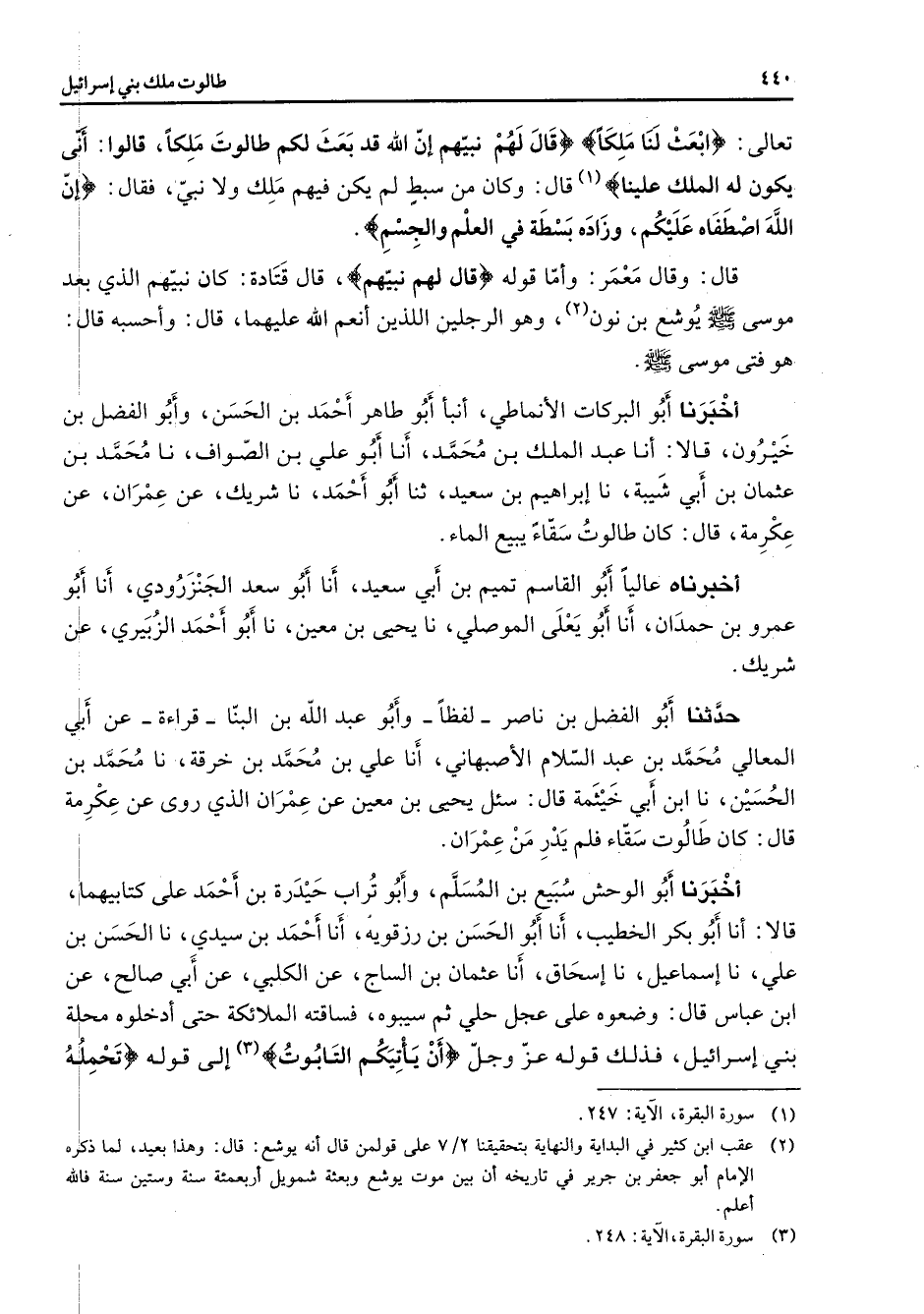 (2) عقب ابن كثير في البداية والنهاية بتحقيقنا 2 / 7 على قولمن قال أنه يوشع: قال: وهذا بعيد لما ذكره الإمام أبو جعفر بن جرير في تاريخه أن بين موت يوشع وبعثة شمويل أربعمئة سنة وستين سنة فالله أعلم