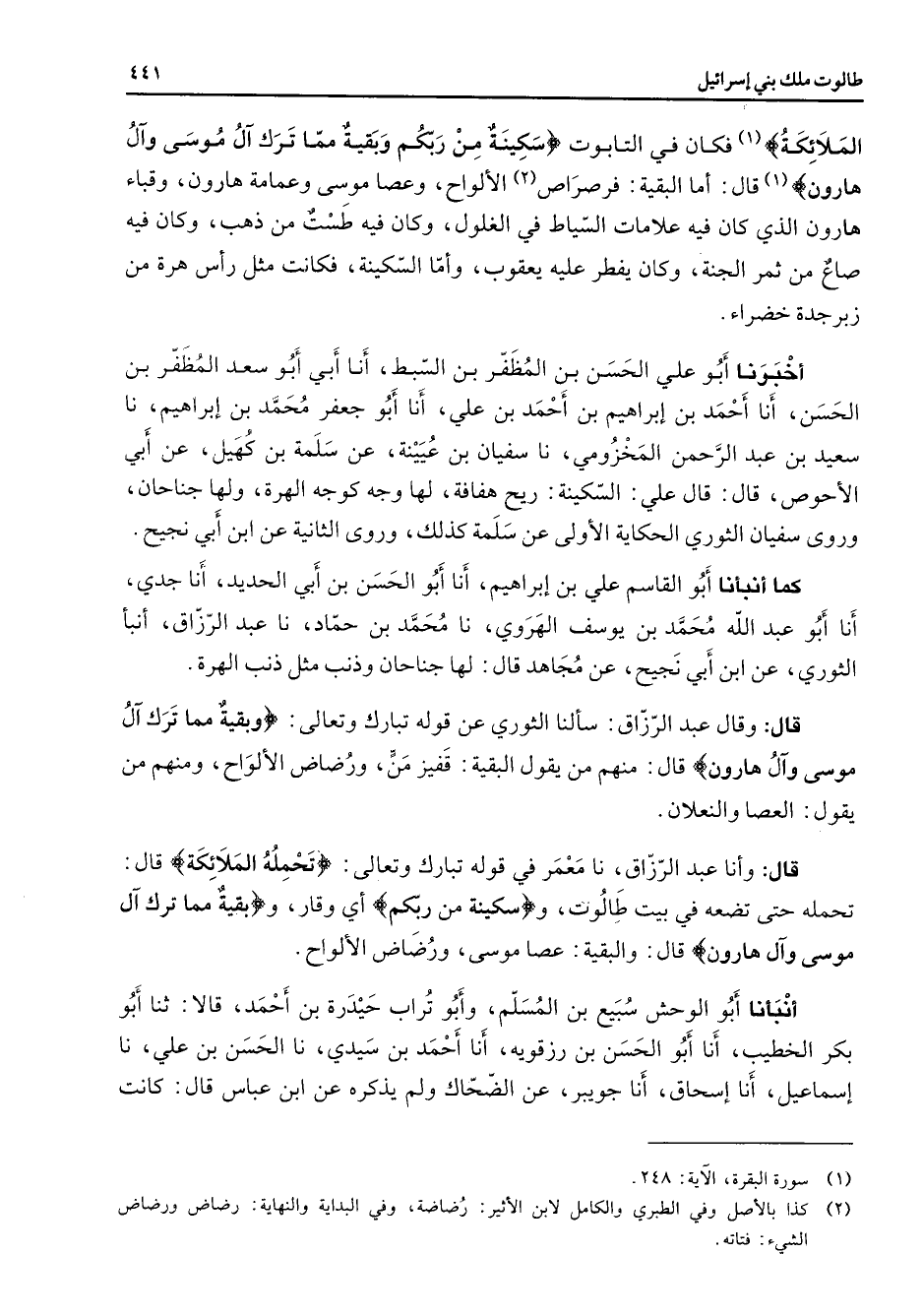 " الملائكة " (1) فكان في التابوت " سكينة من ربكم وبقية مما ترك آل موسى وآل هارون " (1) قال أما البقية فرصراص (2) الألواح وعصا موسى وعمامة هارون وقباء هارون الذي كان فيه علامات السياط في الغلول وكان فيه طست من ذهب وكان فيه صاع بن ثمر الجنة وكان يفطر عليه يعقوب وأما السكينة فكانت مثل رأس هرة من زبر جدة خضراء أخبرنا أبو علي الحسن بن المظفر بن السبط أنا أبي أبو سعد المظفر بن الحسن أنا أحمد بن إبراهيم بن أحمد بن علي أنا أبو جعفر محمد بن إبراهيم نا سعيد بن عبد الرحمن المخزومي نا سفيان بن عيينة عن سلمة بن كهيل عن أبي الأحوص قال قال علي السكينة ريح هفافة لها وجه كوجه الهرة ولها جناحان وروى سفيان الثوري الحكاية الأولى عن سلمة كذلك وروى الثانية عن ابن أبي نجيح كما أنبأنا أبو القاسم علي بن إبراهيم أنا أبو الحسن بن أبي الحديد أنا جدي أنا أبو عبد الله محمد بن يوسف الهروي نا محمد بن حماد نا عبد الرزاق أنبأ الثوري عن ابن أبي نجيح عن مجاهد قال لها جناحان وذنب مثل ذنب الهرة قال وقال عبد الرزاق سألنا الثوري عن قوله تبارك وتعالى " وبقية مما ترك آل موسى وآل هارون " قال منهم من يقول البقية قفيز من ورضاض الألواح ومنهم من يقول العصا والنعلان قال وأنا عبد الرزاق نا معمر في قوله تبارك وتعالى " تحمله الملائكة " قال تحمله حتى تضعه في بيت طالوت و " سكينة من ربكم " أي وقار و " بقية مما ترك آل موسى وآل هارون " قال والبقية عصا موسى ورضاض الألواح أنبأنا أبو الوحش سبيع بن المسلم وأبو تراب حيدرة بن أحمد قالا ثنا أبو بكر الخطيب أنا أبو الحسن بن رزقويه أنا أحمد بن سيدي نا الحسن بن علي نا إسماعيل أنا إسحاق أنا جويبر عن الضحاك ولم يذكره عن ابن عباس قال كانت