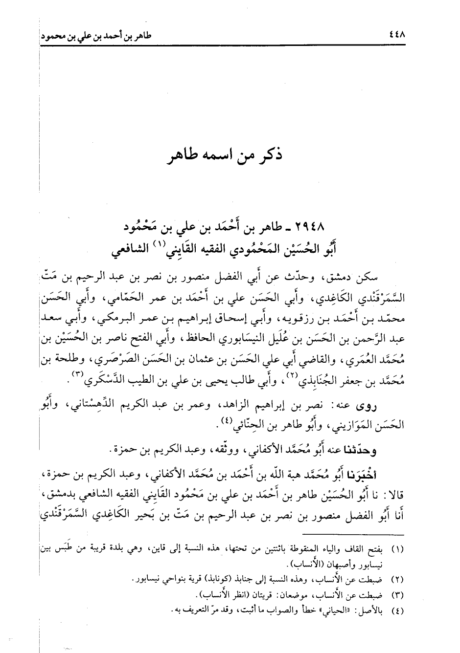 2948 - طاهر بن أحمد بن علي بن محمود أبو الحسين المحمودي الفقيه القايني (1) الشافعي سكن دمشق وحدث عن أبي الفضل منصور بن نصر بن عبد الرحيم بن مت السمرقندي الكاغدي وأبي الحسن علي بن أحمد بن عمر الحمامي وأبي الحسن محمد بن أحمد بن رزقويه وأبي إسحاق إبراهيم بن عمر البرمكي وأبي سعد عبد الرحمن بن الحسن بن عليل النيسابوري الحافظ وأبي الفتح ناصر بن الحسين بن محمد العمري والقاضي أبي علي الحسن بن عثمان بن الحسن الصرصري وطلحة بن محمد بن جعفر الجنابذي (2) وأبي طالب يحيى بن علي بن الطيب الدسكري (3)