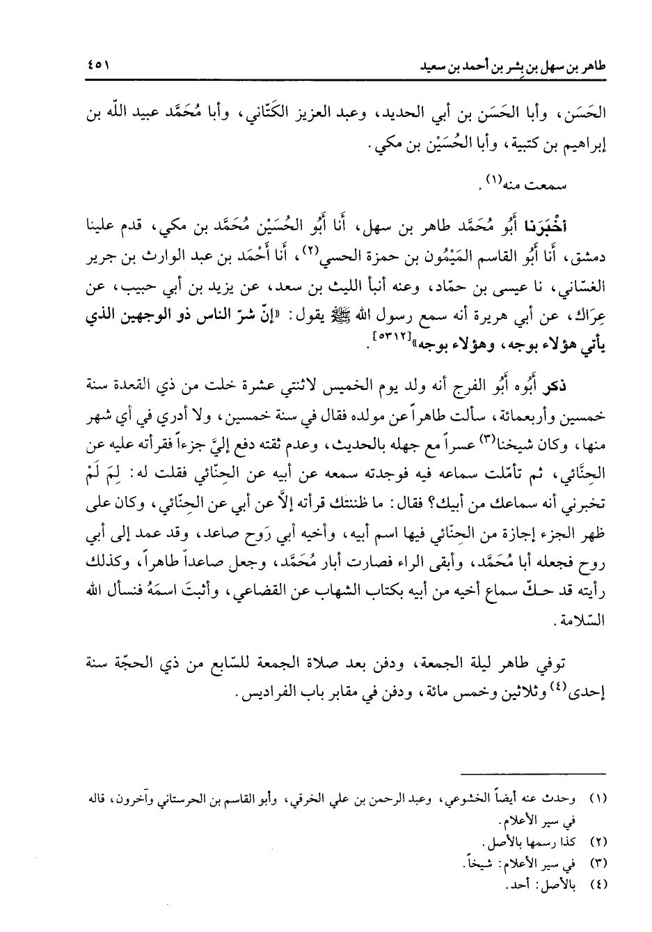 أخبرنا أبو محمد طاهر بن سهل أنا أبو الحسين محمد بن مكي قدم علينا دمشق أنا أبو القاسم الميمون بن حمزة الحسي (2) أنا أحمد بن عبد الوارث بن جرير الغساني نا عيسى بن حماد وعنه أنبأ الليث بن سعد عن يزيد بن أبي حبيب عن عراك عن أبي هريرة أنه سمع رسول الله (صلى الله عليه وسلم) يقول إن شر الناس ذو الوجهين الذي ياتي هؤلاء بوجه وهؤلاء بوجه ذكر أبوه أبو الفرج أنه ولد يوم الخميس لاثنتي عشرة خلت من ذي القعدة سنة خمسين وأربعمائة سألت طاهرا عن مولده فقال في سنة خمسين ولا أدري في أي شهر منها وكان شيخنا (3) عسرا مع جهله بالحديث وعدم ثقته دفع إلي جزءا فقرأته عليه عن الحنائي ثم تأملت سماعه فيه فوجدته سمعه عن أبيه عن الحنائي فقلت له لم لم تخبرني أنه سماعك من أبيك فقال ما ظننتك قرأته إلا عن أبي عن الحنائي وكان على ظهر الجزء إجازة من الحنائي فيها اسم أبيه وأخيه أبي روح صاعد وقد عمد إلى أبي روح فجعله أبا محمد وأبقى الراء فصارت أبار محمد وجعل صاعدا طاهرا وكذلك رأيته قد حك سماع أخيه من أبيه بكتاب الشهاب عن القضاعي وأثبت اسمه فنسأل الله السلامة توفي طاهر ليلة الجمعة ودفن بعد صلاة الجمعة للسابع من ذي الحجة سنة إحدى (4) وثلاثين وخمس مائة ودفن في مقابر الفراديس