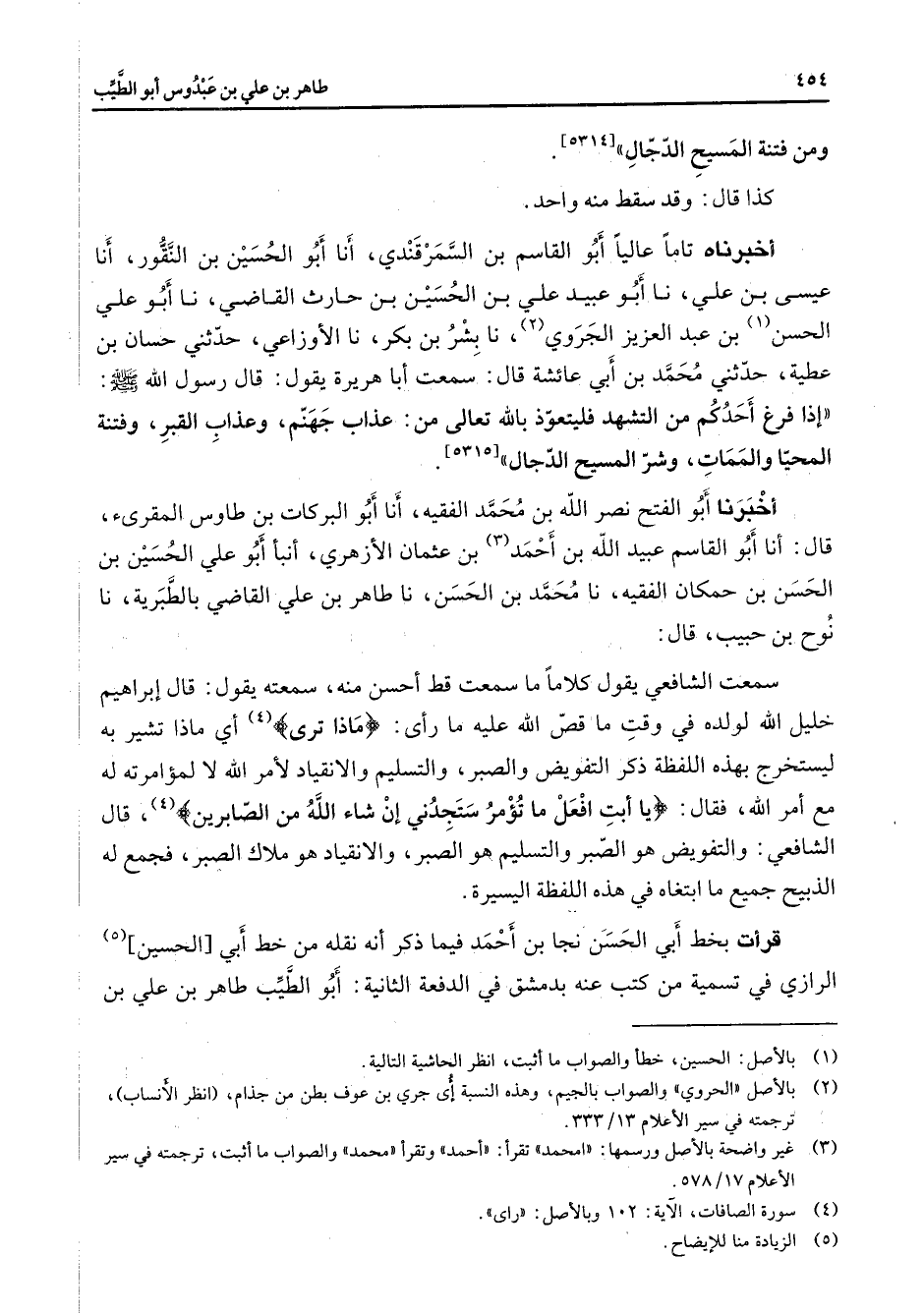 ومن فتنة المسيح الدجال كذا قال وقد سقط منه واحد أخبرناه تاما عاليا أبو القاسم بن السمرقندي أنا أبو الحسين بن النقور أنا عيسى بن علي نا أبو عبيد علي بن الحسين بن حارث القاضي نا أبو علي الحسن (1) بن عبد العزيز الجروي (2) نا بشر بن بكر نا الأوزعي حدثني حسان بن عطية حدثني محمد بن أبي عائشة قال سمعت أبا هريرة يقول قال رسول الله (صلى الله عليه وسلم) إذا فرغ أحدكم من التشهد فليتعوذ بالله تعالى من عذاب جهنم وعذاب القبر وفتنة المحيا والممات وشر المسيح الدجال أخبرنا أبو الفتح نصر الله بن محمد الفقيه أنا أبو البركات بن طاوس المقرئ قال أنا أبو القاسم عبيد الله بن أحمد (3) بن عثمان الأزهري أنبأ أبو علي الحسين بن الحسن بن حمكان الفقيه نا محمد بن الحسن نا طاهر بن علي القاضي بالطبرية نا نوح بن حبيب قال سمعت الشافعي يقول كلاما ما سمعت قط أحسن منه سمعته يقول قال إبراهيم خليل الله لولده في وقت ما قص الله عليه ما رأى " ماذا ترى " (4) أي ماذا تشير به ليستخرج بهذه اللفظة ذكر التفويض والصبر والتسليم والانقياد لأمر الله لا لمؤامرته له مع أمر الله فقال " يا أبت افعل ما تؤمر ستجدني إن شاء الله من الصابرين " (4) قال الشافعي والتفويض هو الصبر والتسليم هو الصبر والانقياد هو ملاك الصبر فجمع له الذبيح جميع ما ابتغاه في هذه اللفظة اليسيرة قرأت بخط أبي الحسن نجا بن أحمد فيما ذكر أنه نقله من خط أبي الحسين (5) الرازي في تسمية من كتب عنه بدمشق في الدفعة الثانية أبو الطيب طاهر بن علي بن