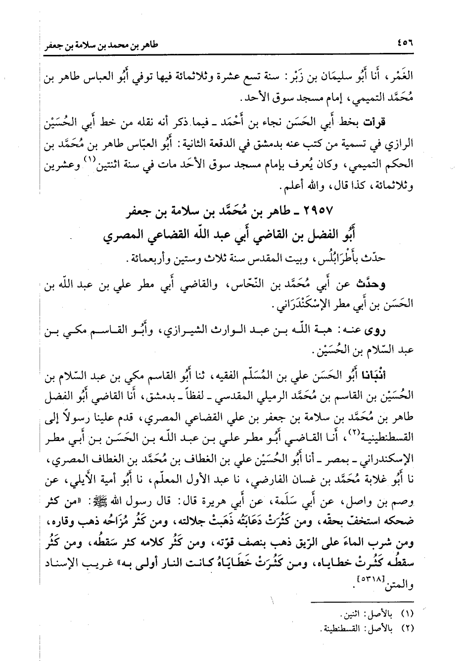 2957 - طاهر بن محمد بن سلامة بن جعفر أبو الفضل بن القاضي أبي عبد الله القضاعي المصري حدث بأطرابلس وبيت المقدس سنة ثلاث وستين وأربعمائة وحدث عن أبي محمد بن النحاس والقاضي أبي مطر علي بن عبد الله بن الحسن بن أبي مطر الاسكندراني روى عنه هبة الله بن عبد الوارث الشيرازي وأبو القاسم مكي بن عبد السلام بن الحسين أنبأنا أبو الحسن علي بن المسلم الفقيه ثنا أبو القاسم مكي بن عبد السلام بن الحسين بن القاسم بن محمد الرميلي المقدسي لفظا بدمشق أنا القاضي أبو الفضل طاهر بن محمد بن سلامة بن جعفر بن علي القضاعي المصري قدم علينا رسولا إلى القسطنطينية (2) أنا القاضي أبو مطر علي بن عبد الله بن الحسن بن أبي مطر الاسكندراني بمصر أنا أبو الحسين علي بن الغطاف بن محمد بن الغطاف المصري نا أبو غلابة محمد بن غسان الفارضي نا عبد الأول المعلم نا أبو أمية الأيلي عن وصم بن واصل عن أبي سلمة عن أبي هريرة قال قال رسول الله (صلى الله عليه وسلم) من كثر ضحكه استخف بحقه ومن كثرت دعابته ذهبت جلالته ومن كثر مزاحه ذهب وقاره ومن شرب الماء على الريق ذهب بنصف قوته ومن كثر كلامه كثر سقطه ومن كثر سقطه كثرت خطاياه ومن كثرت خطاياه كانت النار أولى به غريب الإسناد والمتن