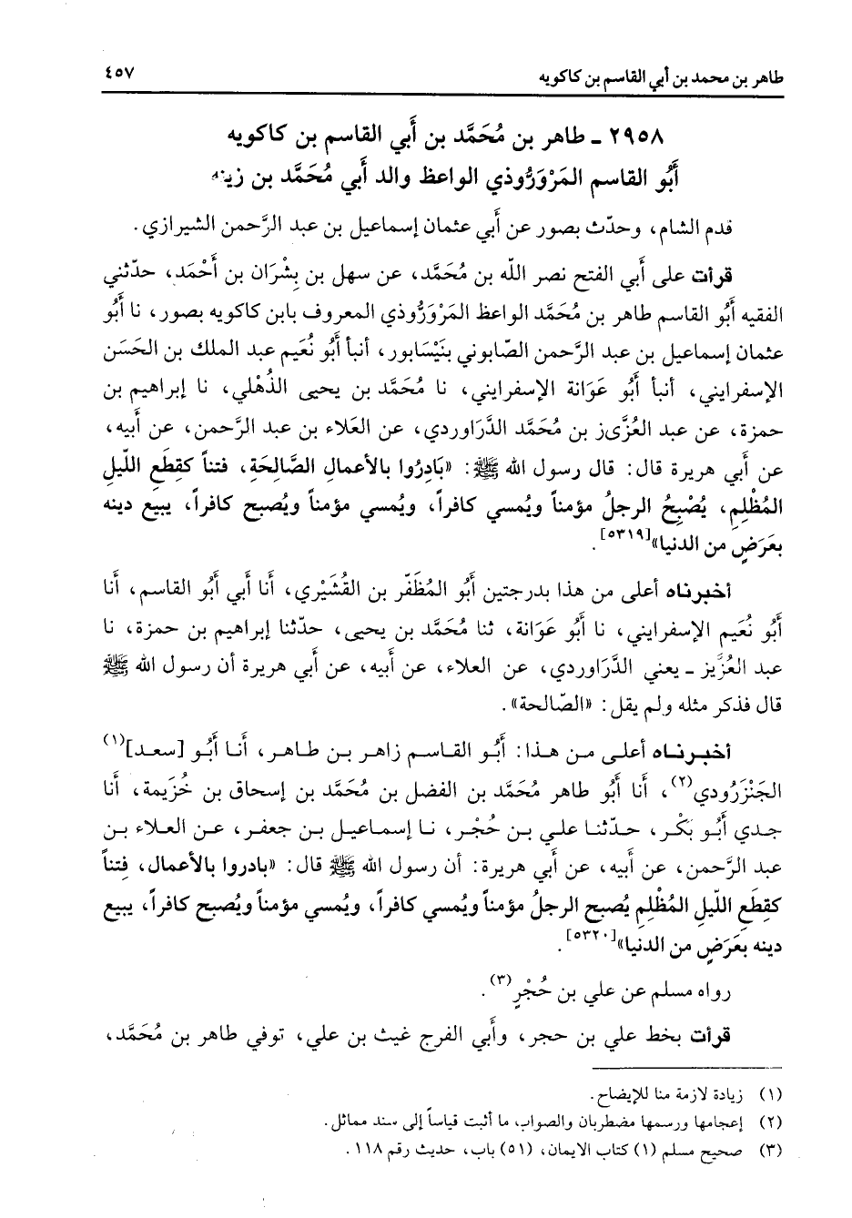 2958 - طاهر بن محمد بن أبي القاسم بن كاكويه أبو القاسم المروروذي الواعظ والد أبي محمد بن زينه قدم الشام وحدث بصور عن أبي عثمان إسماعيل بن عبد الرحمن الشيرازي قرأت على أبي الفتح نصر الله بن محمد عن سهل بن بشران بن أحمد حدثني الفقيه أبو القاسم طاهر بن محمد الواعظ المروروذي المعروف بابن كاكويه بصور نا أبو عثمان إسماعيل بن عبد الرحمن الصابوني بنيسابور أنبأ أبو نعيم عبد الملك بن الحسن الإسفرايني أنبأ أبو عوانة الإسفرايني نا محمد بن يحيى الذهلي نا إبراهيم بن حمزة عن عبد العزيز بن محمد الدراوردي عن العلاء بن عبد الرحمن عن أبيه عن أبي هريرة قال قال رسول الله (صلى الله عليه وسلم) بادروا بالأعمال الصالحة فتنا كقطع الليل المظلم يصبح الرجل مؤمنا ويمسى كافرا ويمسي مؤمنا ويصبح كافرا يبيع دينه بعرض من الدنيا أخبرناه أعلى من هذا بدرجتين أبو المظفر بن القشيري أنا أبي أبو القاسم أنا أبو نعيم الإسفرايني نا أبو عوانة ثنا محمد بن يحيى حدثنا إبراهيم بن حمزة نا عبد العزيز يعني الدراوردي عن العلاء عن أبيه عن أبي هريرة أن رسول الله (صلى الله عليه وسلم) قال فذكر مثله ولم يقل الصالحة أخبرناه أعلى من هذا أبو القاسم زاهر بن طاهر أنا أبو سعد (1) الجنزرودي (2) أنا أبو طاهر محمد بن الفضل بن محمد بن إسحاق بن خزيمة أنا جدي أبو بكر حدثنا علي بن حجر نا إسماعيل بن جعفر عن العلاء بن عبد الرحمن عن أبيه عن أبي هريرة أن رسول الله (صلى الله عليه وسلم) قال بادروا بالأعمال فتنا كقطع الليل المظلم يصبح الرجل مؤمنا ويمسى كافرا ويمسي مؤمنا ويصبح كافرا يبيع دينه بعرض من الدنيا رواه مسلم عن علي بن حجر (3)