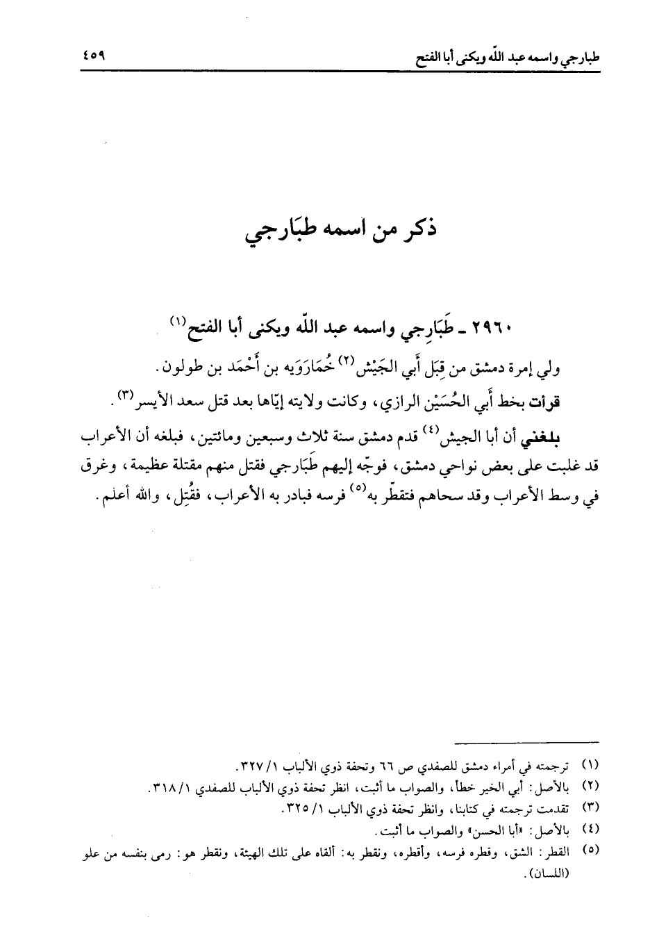 2960 - طبارجي واسمه عبد الله ويكنى أبا الفتح (1) ولي إمرة دمشق من قبل أبي الجيش (2) خمارويه بن أحمد بن طولون قرأت بخط أبي الحسين الرازي وكانت ولايته إياها بعد قتل سعد الأيسر (3)